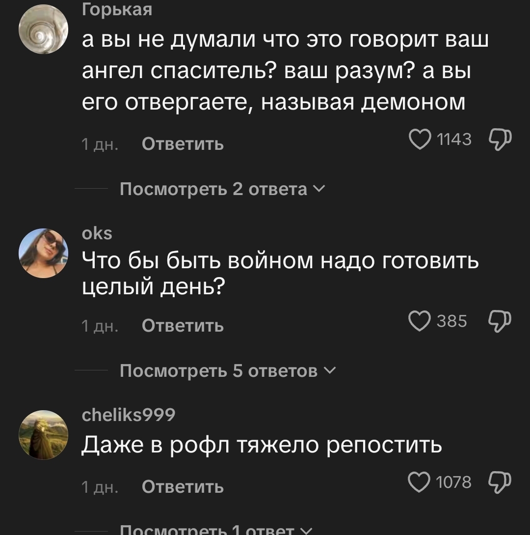 >>6426240 «Вторые семьи» это конечно бывает но очень редко, я из ровесников таких даже не знаю, слышала конечно рассказы от старших, но буквально пару кейсов. В основном просто измены без какой либо серьезности. Даже сравнивать с второй женой в исламе глупо. Изменяют то как в основном, выпили вместе да и все. Или же с бывшими. Или же с какой нибудь рсп которая сама навязывается, не знаю почему но не уважают себя и лезут к женатикам именно рсп/мамы одиночки, там закономерность какая то шизовая. Пусть хоть 17 лет но уже с ребенком будет такая. Типа свою семью не сохранили давай и других влезать