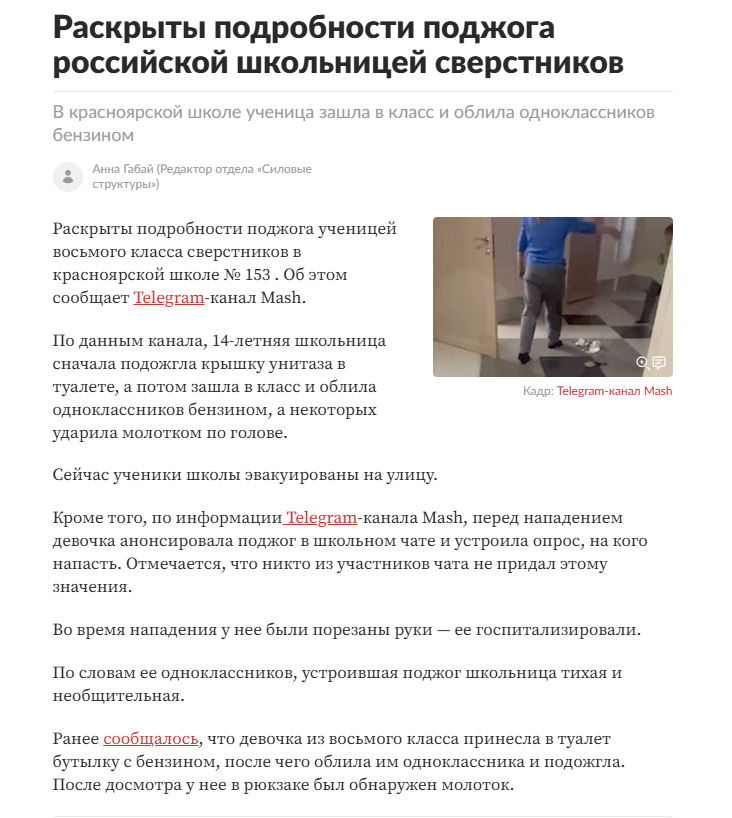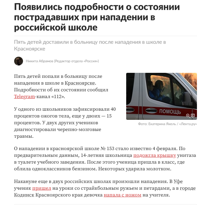 >>6426596 > подожгла хуемразей: Дааа, так этих хуемразей, главное это удобные новости читать, а не как было на самом деле Одну из учениц, пострадавших при поджоге в красноярской школе, доставят санавиацией в Москву — 17-летняя девочка на ИВЛ в тяжёлом состоянии.