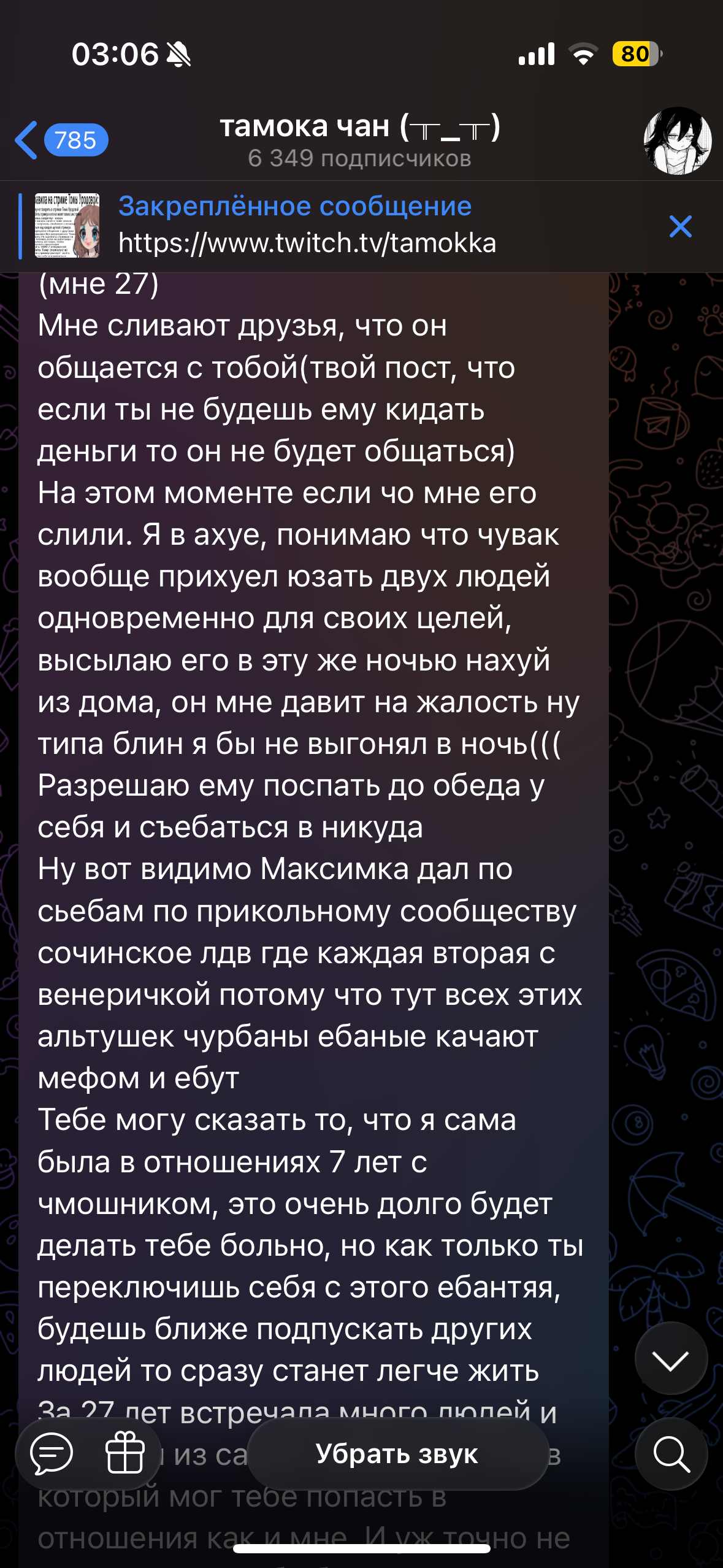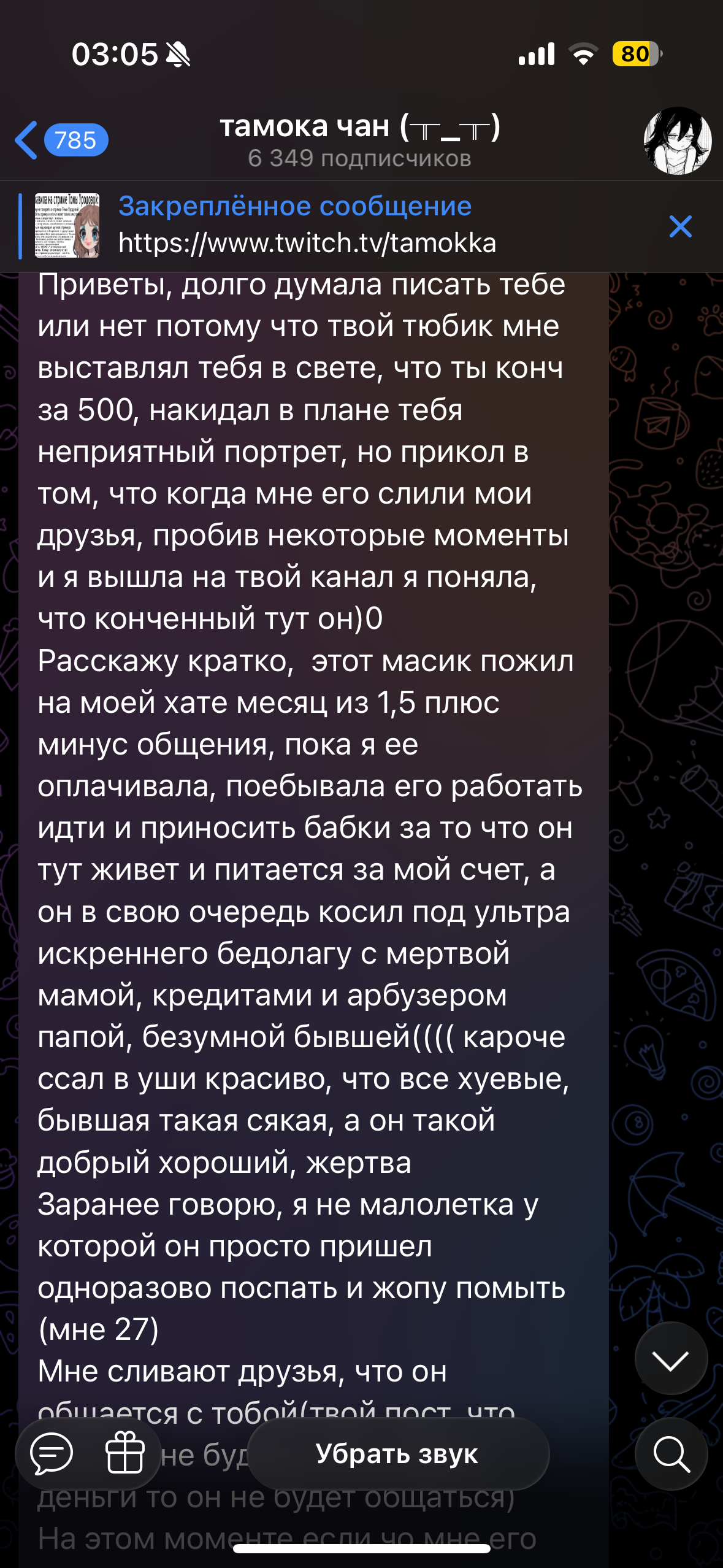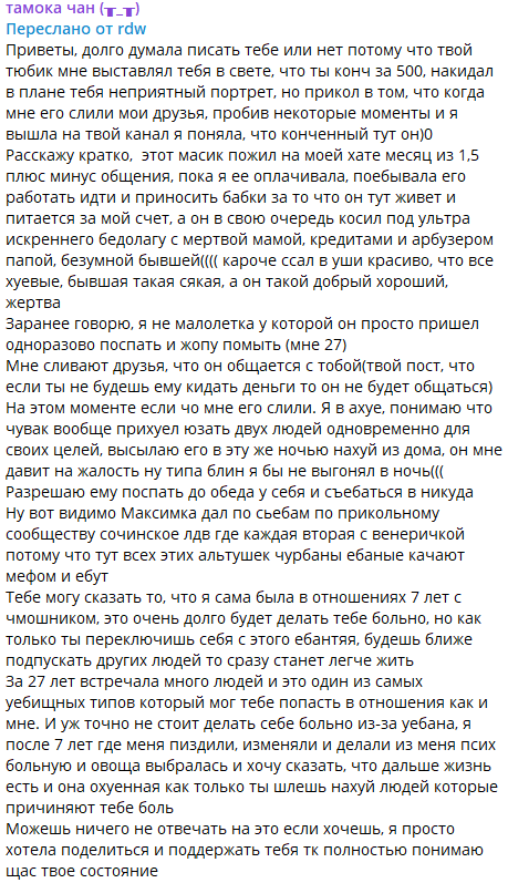>>6426884 Сисы, вы пропустили. Там была жара, когда она подселила к себе девочку в квартиру и в соседней комнате душила себя, чуть не довела до суицида, жта тянка была в ахуе и не знала че делать с томой. И потом они еще разругались сильно. А так же я сохранила скрин про ее бывшего парня, который отслужив в армии, съебал в мск и кормил Тому обещаниями, что купит ей билет и вообще он ее очень сильно ждет. В итоге опрокинул, вешал лапшу на уши и до недавнего времени вешал и просил бабки на свои хотелки. Сорян сумбурно писала, скрины девушки парня томы