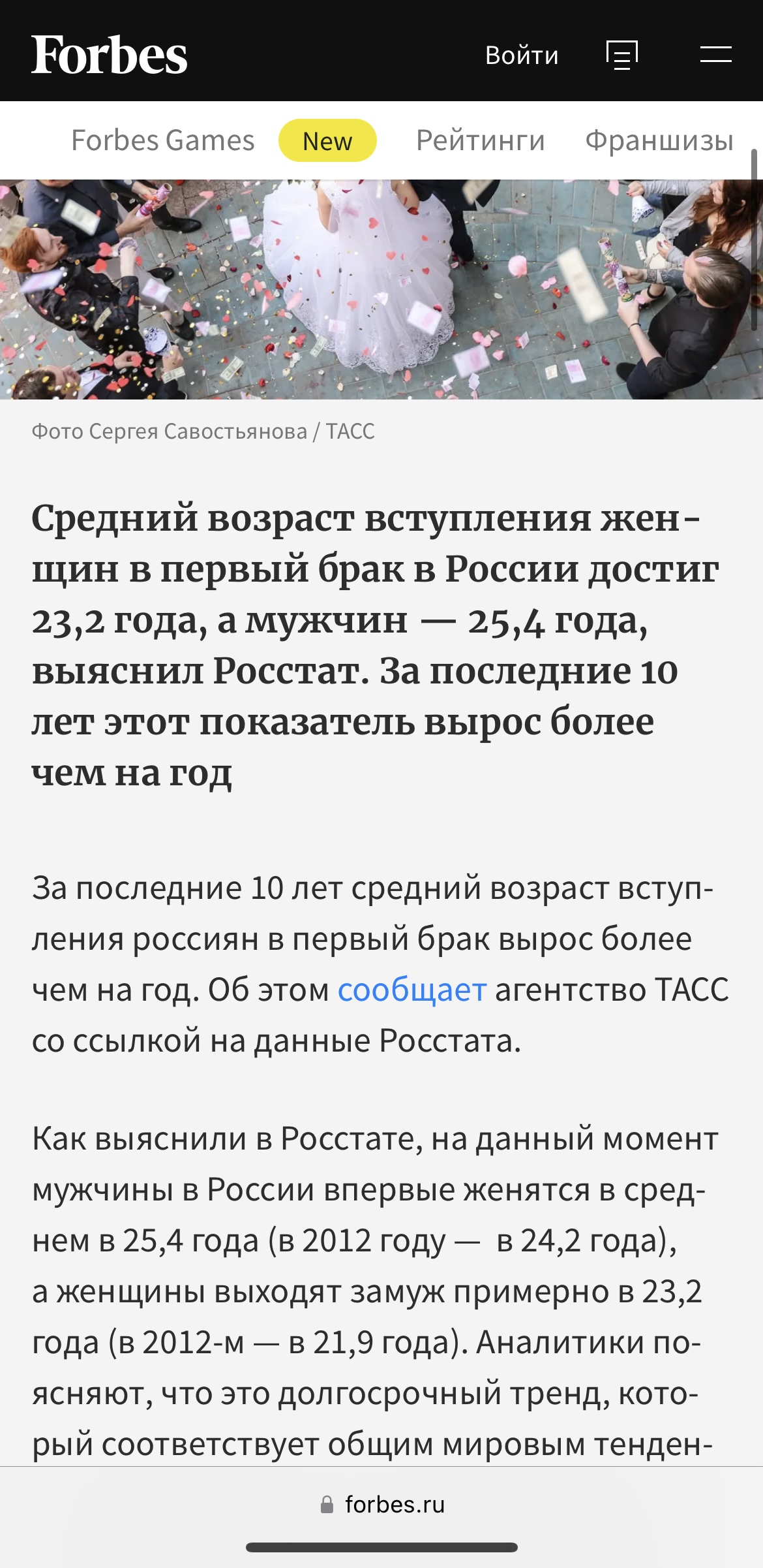 >>6429191 >Средний возраст вступающих в брак россиян заметно вырос за последние пять лет Не вижу слова «ВПЕРВЫЕ вступающих в брак», то есть в твоей статистике выборка вообще среди всех, в том числе среди тех кто и во второй и в третий раз замуж выходит. А по поводу первого брака, то статистика говорит вот что, статья от 2023 года, думаю за 2,5 года ситуация не сильно поменялась