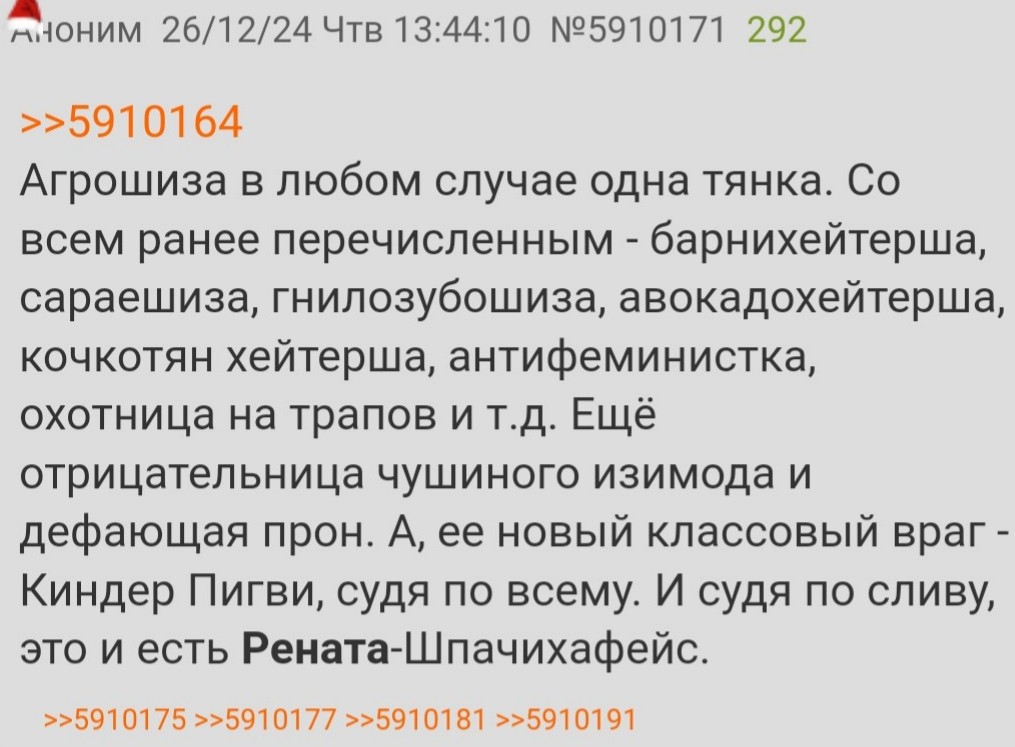 Вообще интересно, что этот чушок (нацилесба?) начал строить какое-то соломенное чучело из разных тян. Похоже на стиль местной агрошизы Риты-Ренаты. А она придумала своего "сталкера" после своего слива. Или Нацилесба очередная субличность Риты-Ренаты? Может вообще сашко опять устраивает траллинг и разводит эту шизу? Тут чушки любят тян стравливать, а нацилесба как раз имеет типичную мизогинную чушинную прошивку. Хмм...