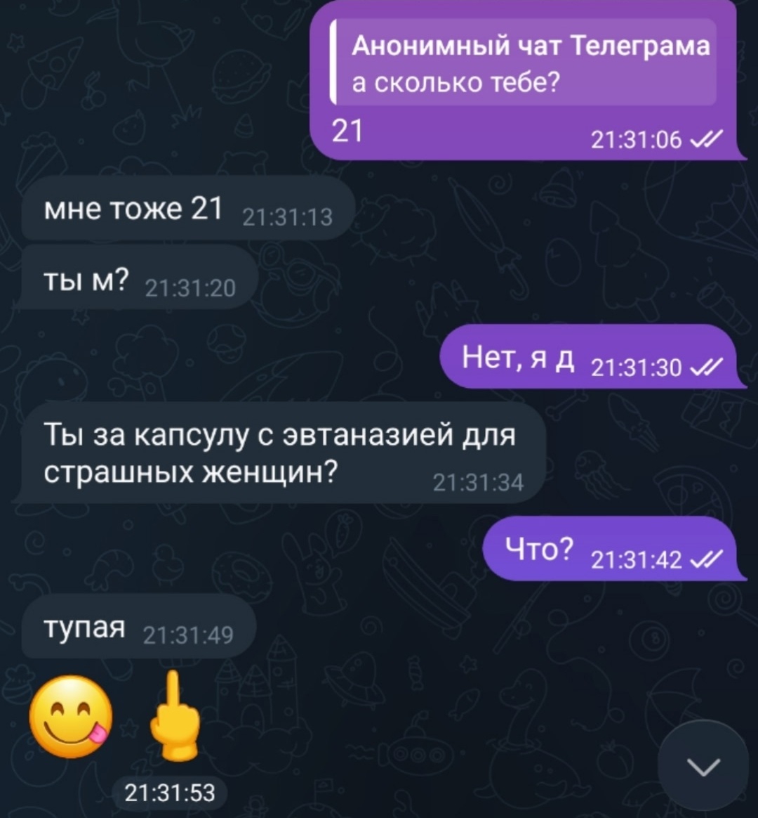 >>6443671 Базилиус. У меня так все бывшие кроме одного прибегали, тот уже 3 года дохуя гордый пиздец в чс держит и не пишет, хотя я-то знаю, как он себя после расставания вёл, сидел весь в слезах с бутылкой в обнимку, и чё про меня пиздел каждому, кто ему на глаза попался. И все до единого после расставания уже сука через секунду на сз оказывались, хотя подозреваю, что были они там ещё до "официального" заявления расстаться. Никого я не кидала по своей инициативе, только они меня, а потом сами же сидели ныли мне, вернись пися ты у миня первая ляповь. Да и даже не бывшие в плане отношача, а с кем просто общались - и то нет-нет, да всплывут со своими кагдилами, правда дальше пиздежа в инете дело не заходит, чё воздух сотрясал не понятно. Даже вон пара додстеров со школы, за которыми я бегала в своё время, а они меня попускали и демонстративно ползали за стейсичками (которые щас либо разжирели на 50 кг, либо тоже вовсю родили от других уже) - выкатили после школы яйца в личку, типа "ой мань знаешь а ты мне вообще-то нравилась всегда)". А хули ты в своё время-то эту "взаимность" не показывал, уёбок? А, ну да, крутые кентики и стейсухи не одобрили бы выбор, точняк.