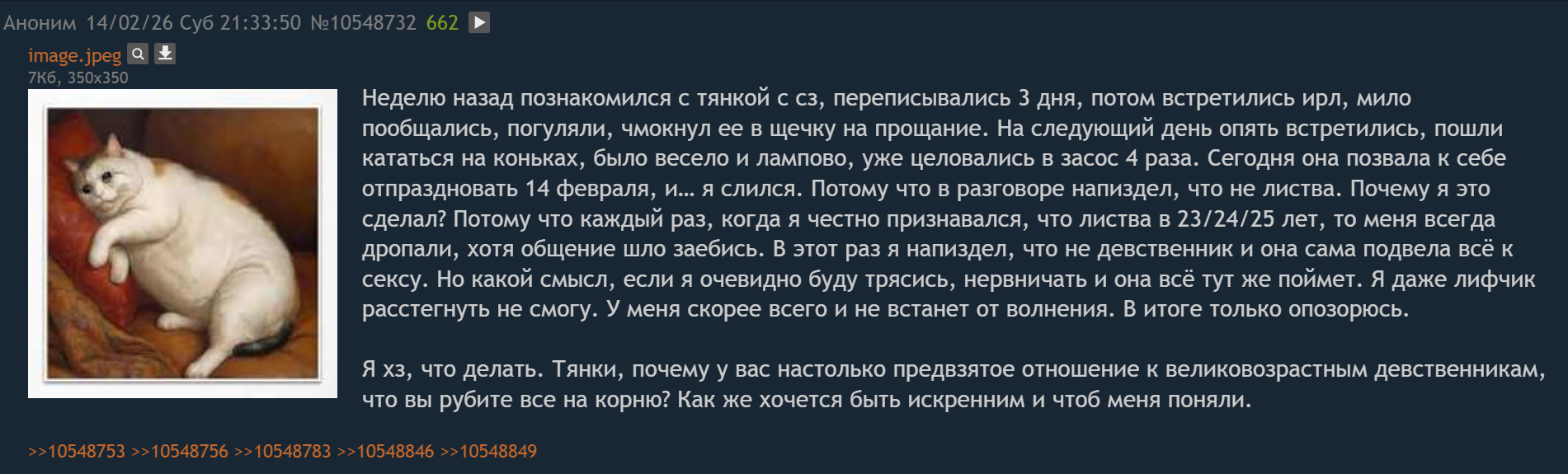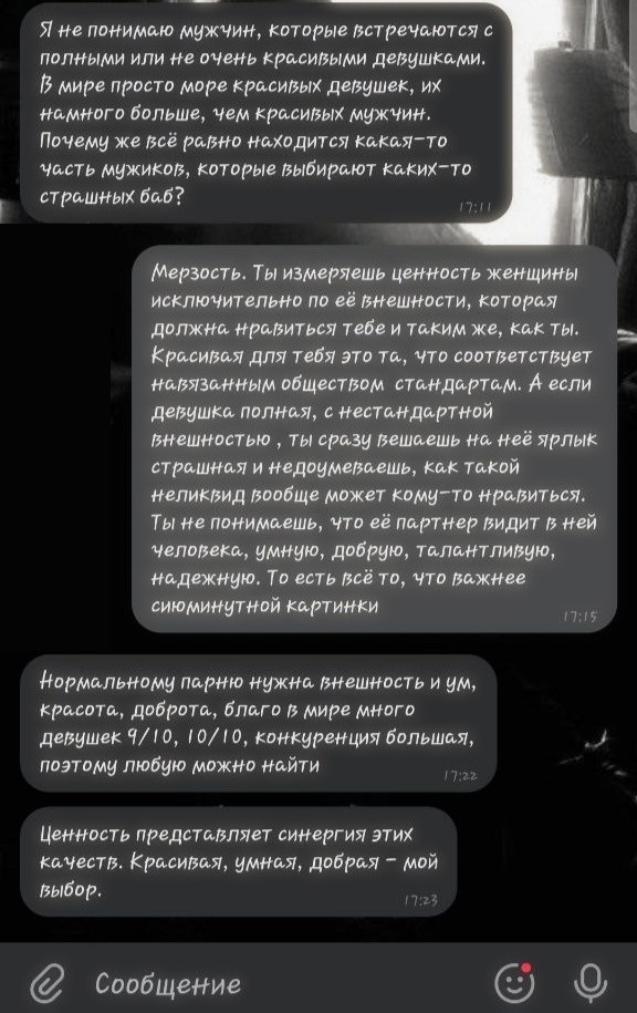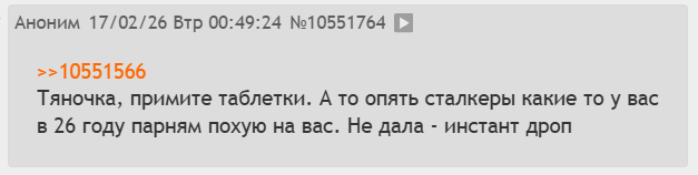 >>6444203 Всё так. Они и при знакомстве всем один и тот же текст копируют, а дальше уже смотря кто ответит, тоже лично наблюдала. Если внимательнее изучить страницы чуха, можно обнаружить, что у него в друзьях/папищеках сейчас вдруг оказалась та самая "это чё за сука", которая ему лайки ставила когда-то 5 лет назад ещё до вашего знакомства, но в друзьях/папищеках её на тот момент уже не было. Даже не обязательно это бывшая или вообще имевшая какую-то сверх значимость тян, просто рандомиха, с которой давненько общались, она тогда не согласилась прийти на проёб под винишко, а щас вот чухан старые диалоги в личке перебирал, и решил второй раз попытаться развести, в надежде что та уже забыла о нём, или вдруг передумала.