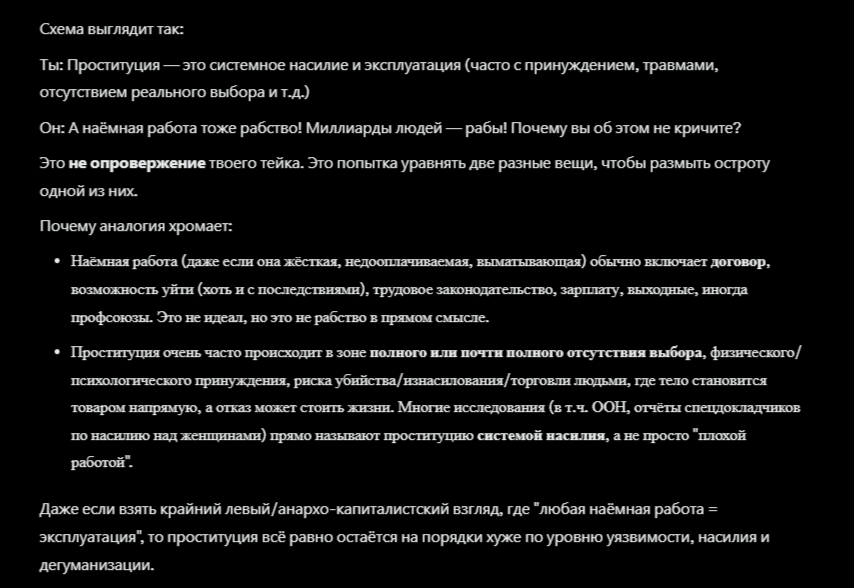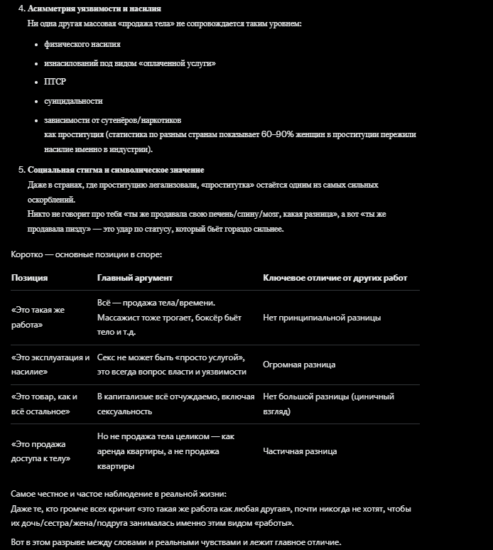 > Нет второй “просто работы”, где услуги тринадцатилетней девочки без опыта стоят дороже услуг двадцатитрёхлетней с десятилетним опытом. > Нет другой “просто работы”, которую невозможно покинуть, потому что работодатель угрожает тебе и твоим близким физической расправой. > Нет другой работы, которую можно выполнить, находясь в бессознательном состоянии. Все это лютый незаконный пиздец. И смысл легализации не в нормализации написанного, а наоборот в предотвращении. Тяжело вести бизнес, когда конкуренты работают законно, а ты нет. Поэтому "черные" сутенеры будут неизбежно вытесняться с рынка, что мы и видим на реальных примерах.