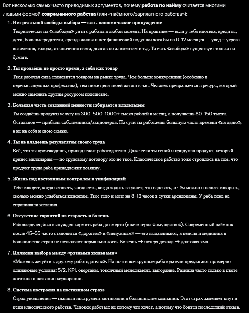 >>6446605 Рабство — это система социальных отношений, при которой один человек (раб) является собственностью другого человека (рабовладельца). Раб лишен большинства прав и свобод, присущих свободным людям, и находится в полной власти своего владельца. Работа в найме - это не рабство по определению. Давайте без этого дебилизма. Работая в найме ты не находишься в полной власти своего владельца. Ты работаешь ровно там и за такую оплату, которую заслуживаешь. Если хочешь больше или лучше, то качаешь скиллы и находишь другое место тогда, когда тебе хочется. Если ты на это не способен, то это твои проблемы.