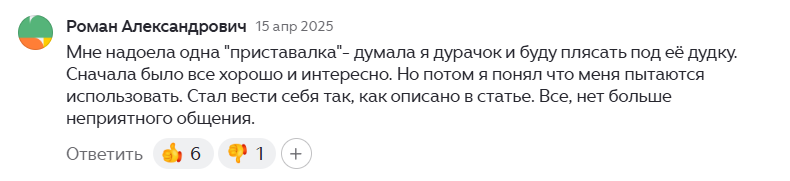 Статья: "как понять, что человеку вы безразличны", актуальная в общем-то для обоих полов Комменты: да всё правда, было такое к сожалению, уходите от таких людей, и т.д.