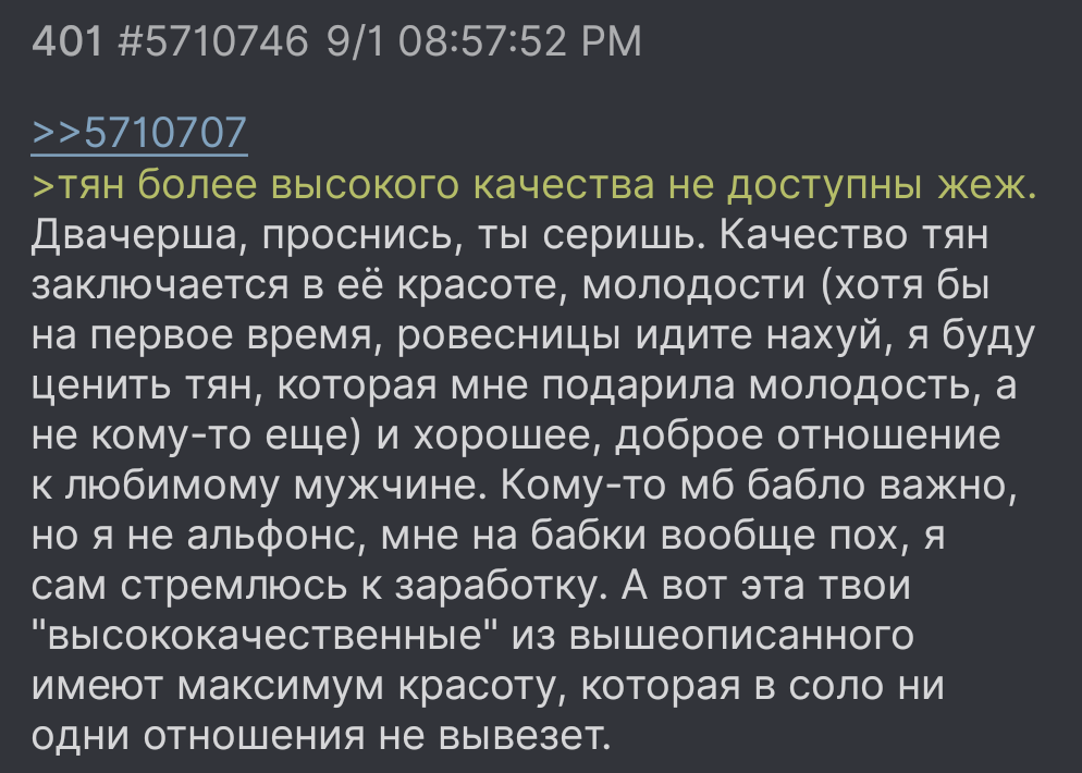 >>6453360 Я знаю, что эти "качества" важны для некоторых, может даже многих чухов, но дело в том, что мне самой чух с такими ценностями не нужен. Дело не в том, что это странный закидон или я не подхожу под эти критерии, просто это лишь индикатор и ниточка, которую если потянуть, начнет распутываться такой клубок пиздеца, что лучше такие отношения за колиметр обходить