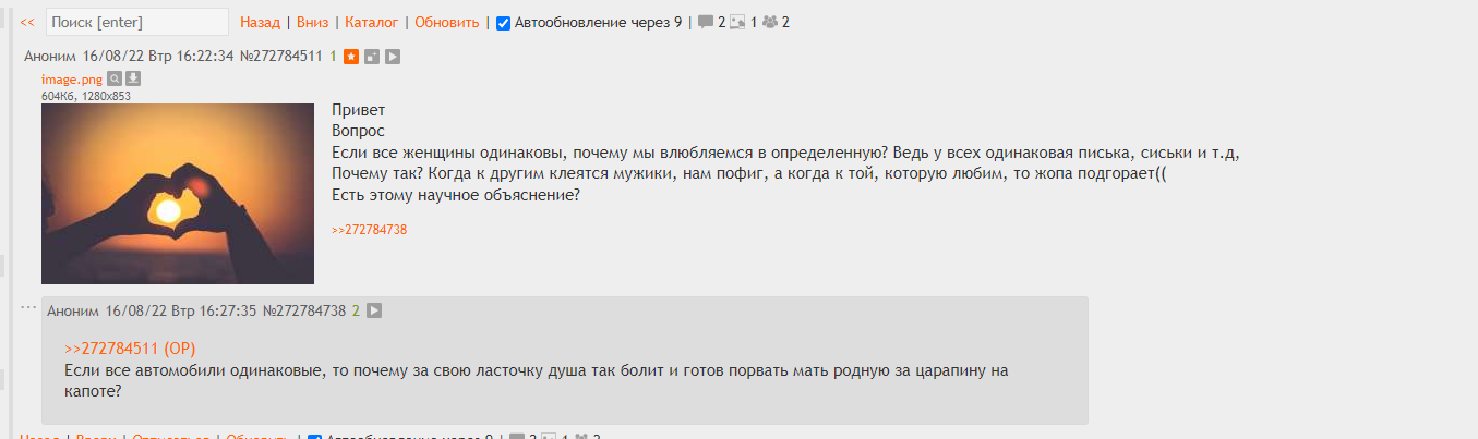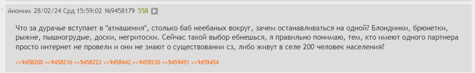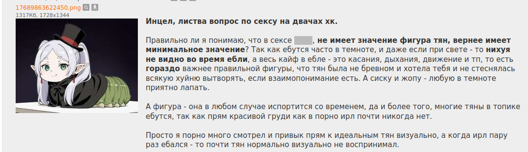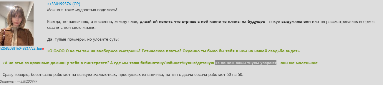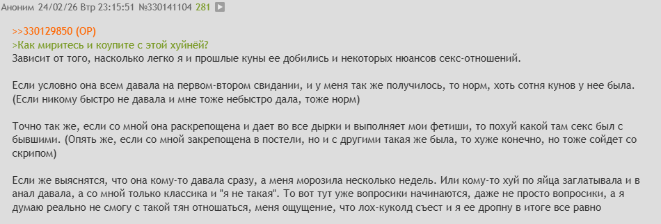 >Вам будет проще разойтись до секса. >И еще неоднократно проверено на чушиной логике (что подтверждается чушками сверху), они воспринимают тян, которая им не дает, как приличную. >Но она и есть приличная, если реально ни с кем не спит Это какой-то инцел глубокого залегания тут писюх малолетних пытается воспитывать?