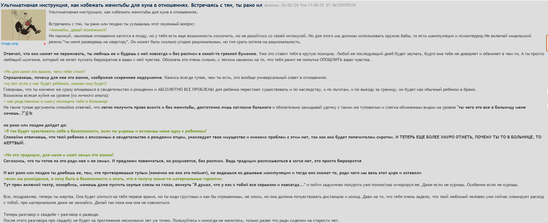 >>6469578 Адепты Поднебесного ещё существуют? Меня его формулировки всегда смешили и сам он темный персонаж. Не думаю, что его формулировки даже инцелье всерьез использует если вообще про них кто-то помнит.