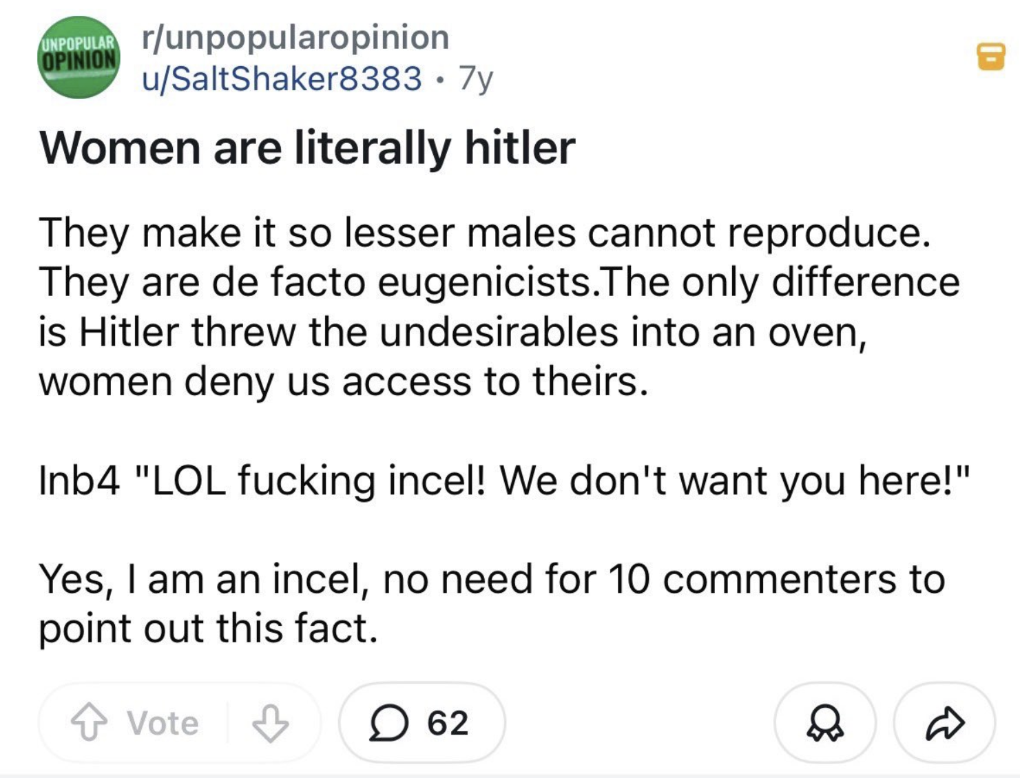 Лол, кто бы мог подумать, что инцелошища окажется тупее даже самых проспиртованных ватных дегенератов, смотрящих россия 1 весь день, ведь даже они уже не верят в пукнумские 140%