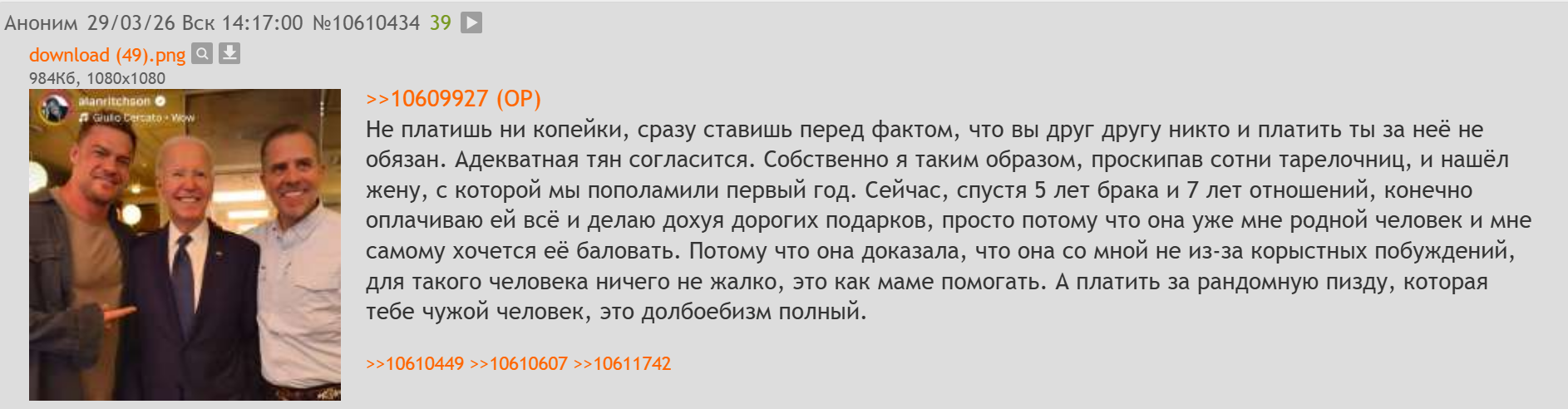 >>6440092 Он просто ахуел. Каждодневный секс — точно такое же элитное потребление. Такая же эгоистичная придурь и хотелка, как сто роз каждый день. Это про потребление и про поставить своих близких раком. Про доминацию и утвердить иерархию, что его желания тут главнее всего. Просто некоторые женщины и мужчины привыкли с мужскими хотелками носиться как с писанной торбой. Истерить, визжать, топать ножками и прочее. И жены их кудахчут - как же так, моему масику не сосали ровно полдня, все, он умирает, еще час и скорую вызывать пора будет. Одинокие мужчины спокойно дрочат и ничего — живы и здоровы. В паре должен быть секс, но история про "каждый день" и мужские истерики - это чисто про то, чтобы жену выдрессировать как собаку на подчинение и показать ей место.