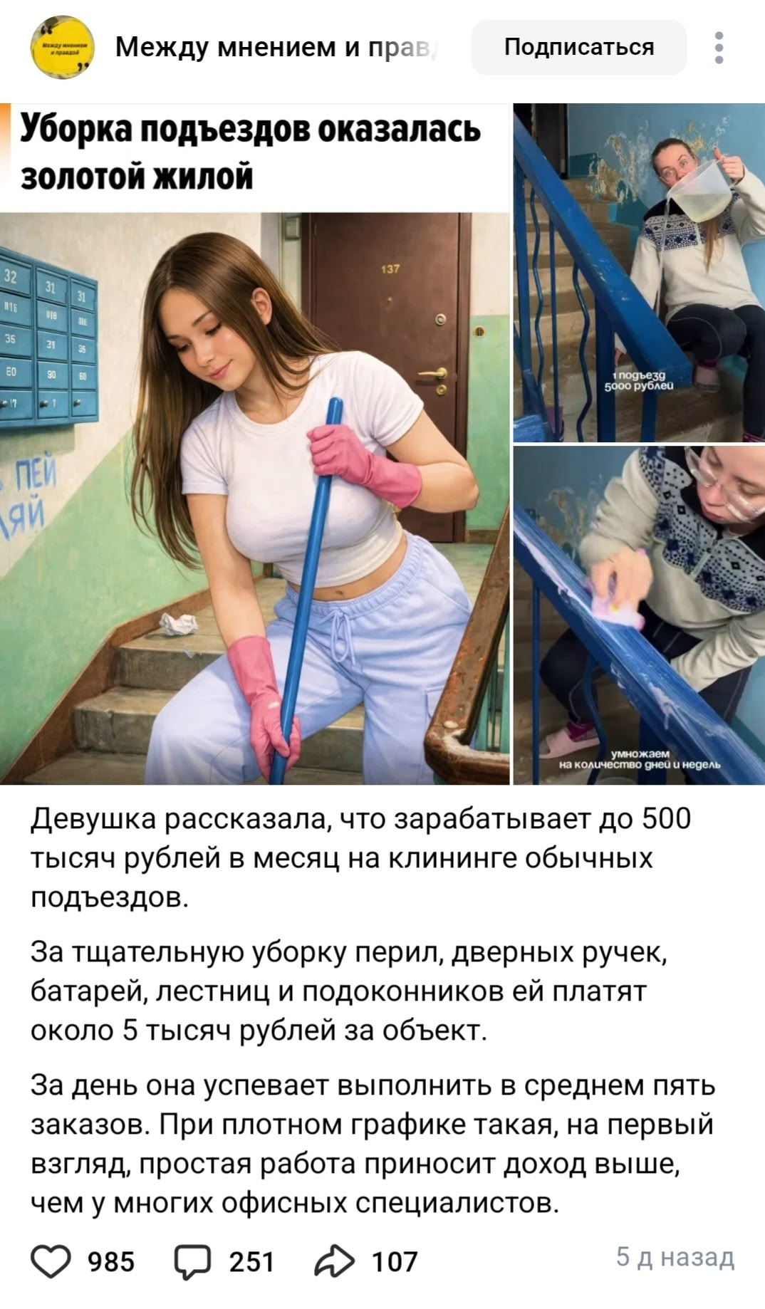 >>6448435 как за день можно вымыть 3 подъезда, если это не падики в хрущевках пятиэтажных? тут же и пол надо вымыть, и перила, и окна, и лифты, и входную группу, и балконы. если это подъезд в каком-нибудь человейнике на 25 этажей, то и за 8 часов не управишься