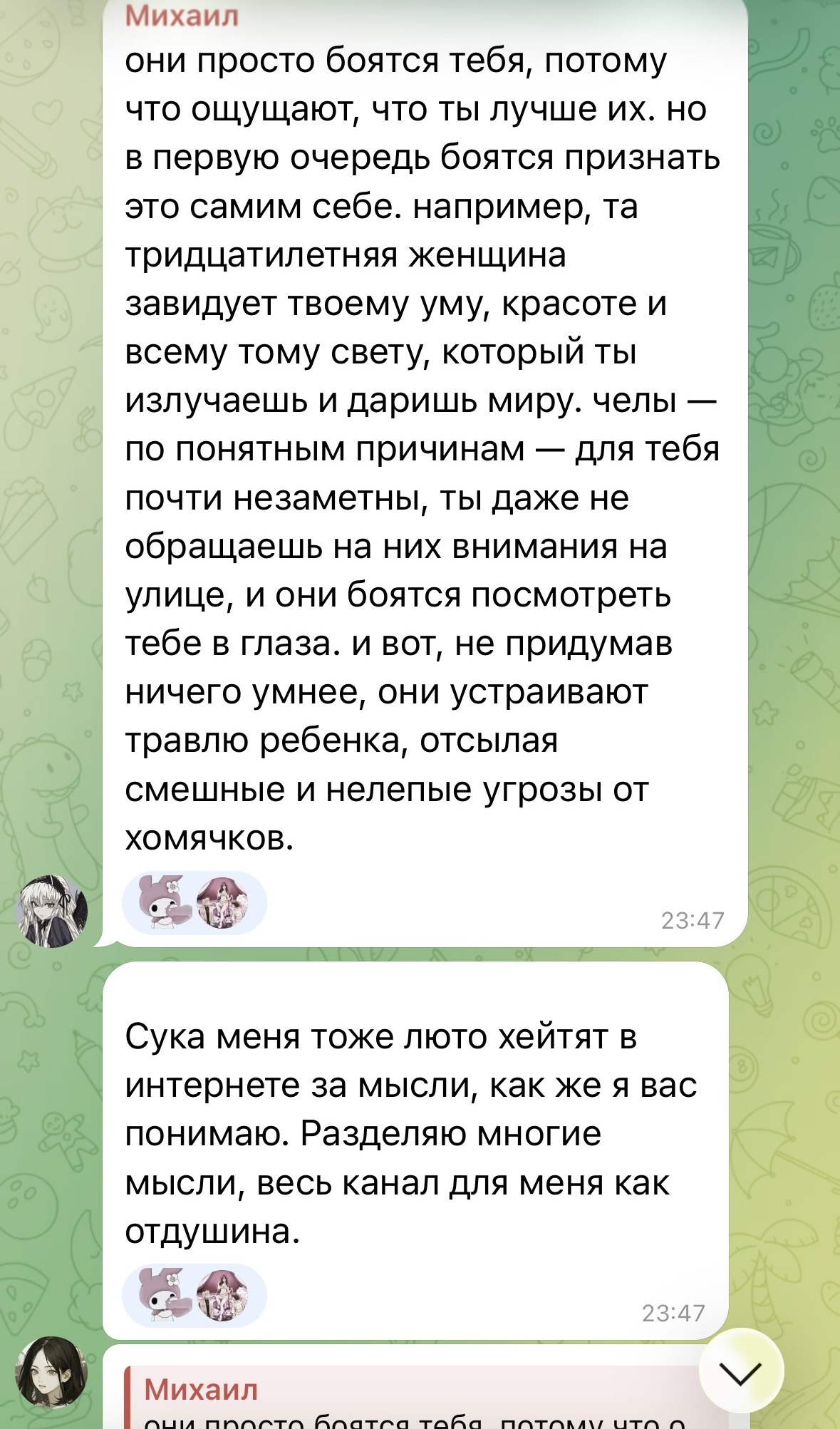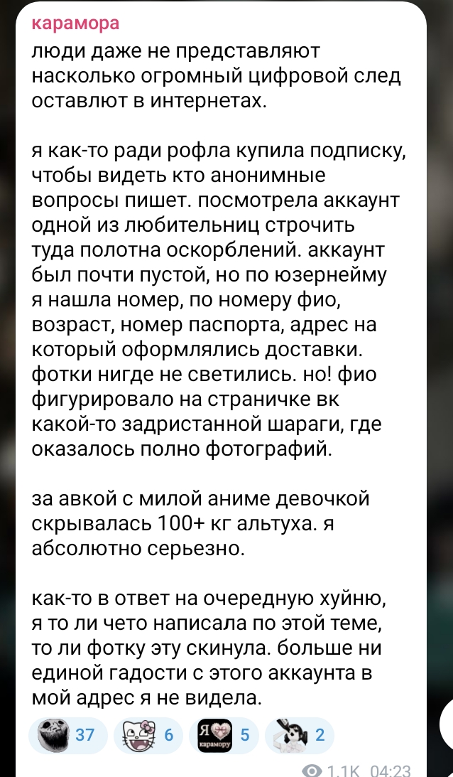 Интересно, Карамориха уже чекнула своего преданного подписчика Михуила. У тебя там все с авками милых аниме девочек. Скажи спасибо что там тянки, а не 30лвл гипертоники с вялым хуем