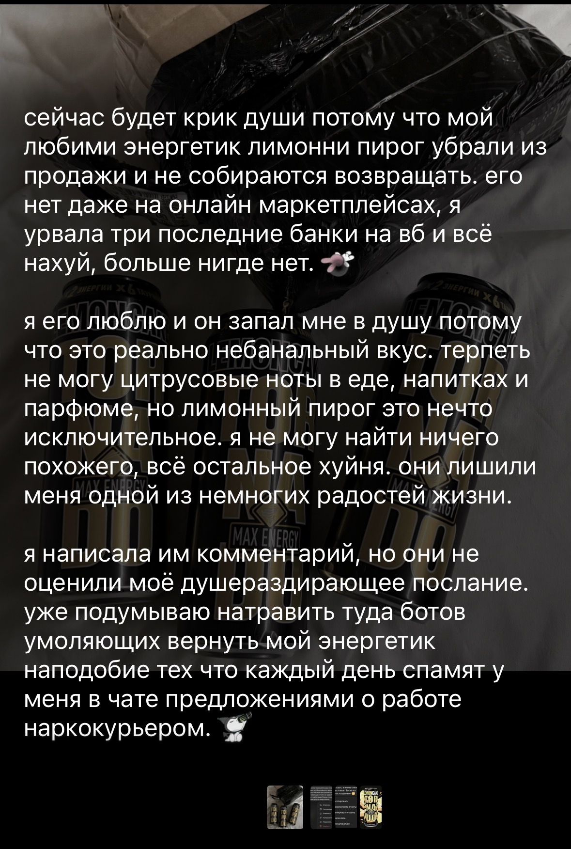 >>6446594 Угу, а по итогу все смеются и считают ее клоуном а потом просто старой неудачницей, которая из-за отсутствия денег жрет кошачий корм, мб, я бы со своим характером и могла заниматься чем-то таким, но понимаю, какую реакцию это вызовет. Ну и нахуя мне это, только же еще больше мрачнеть буду. Впрочем, я давно не выхожу из дома, ну нахуй, подальше от людей, не вывожу, слишком слабая и аморфная. Да и почти никогда не пишу про себя, это я вот изрыгнулась сегодня, еще пмс голову ебет, в другом бы состоянии, наверное, не стала писать, а так, выходит, что раздрачиваю себя.
