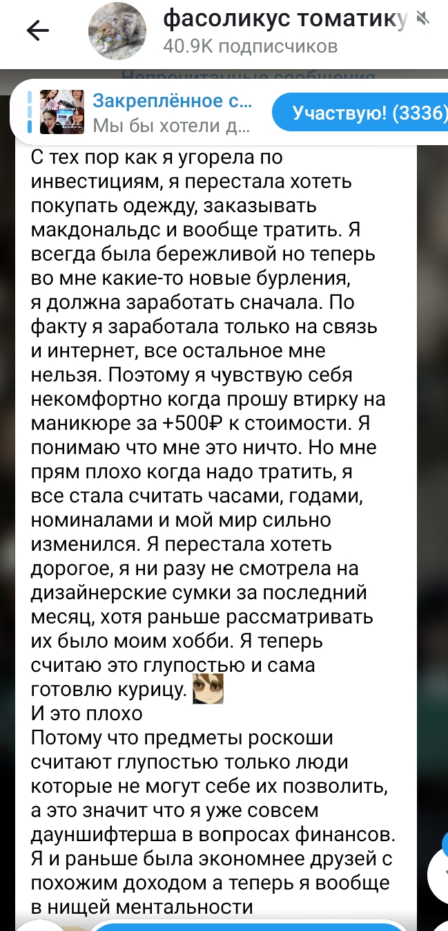 Наконец-то что-то более менее искреннее от Консервы. В том то и суть, что она лютая бабка скупердяйка. Нахуя было демонстративно потреблять сумочки и всратые башмаки. Так это глупо и неественно от нее смотрелось.