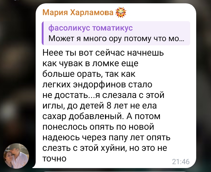 >>6446205 >Ну типа есть люди которые курят при мамке что ли? Ну у меня мама примерно после 20 лет, когда я домой на каникулы приезжала, могла предложить сижку или стопарик коньяка хорошего накатить иногда, лол. Но она вообще сама курит почти всю жизнь, а мне от любого никотина плохо становится, я максимум половину сигареты скурить могу, потом хуево делается. Но я так "курила" за компанию с ней, а мама угорала с этого, мол ну ты вообще не куряка, ну всё давай туши сигу, а то плохо станет. До этого она просто залезла ко мне в вк и увидела, что я и на перекуры гоняю между парами, и фотки с бухлом на столе, и всё такое.С мамой всё в порядке, просто я к ней приехать не могу уже который год