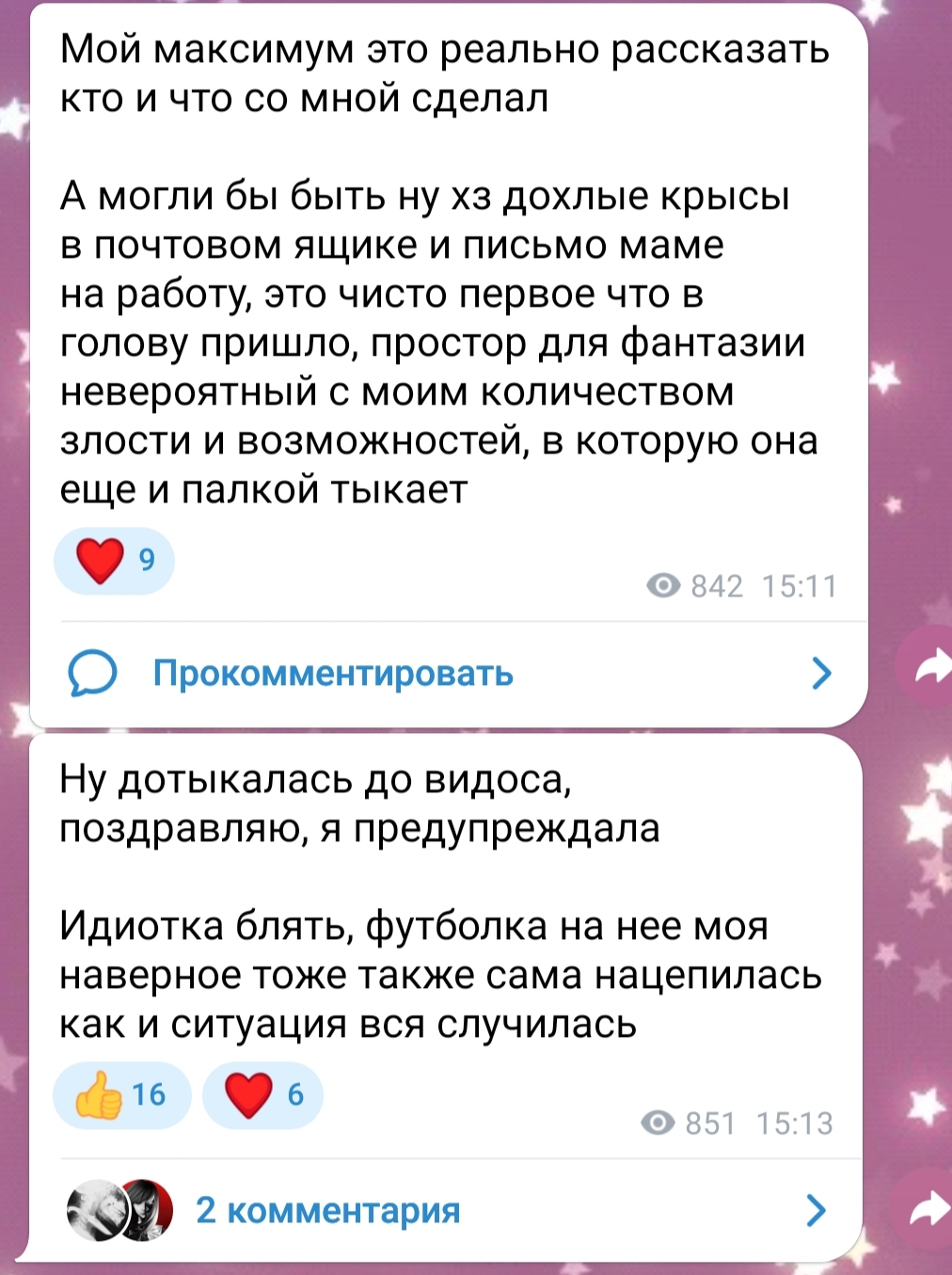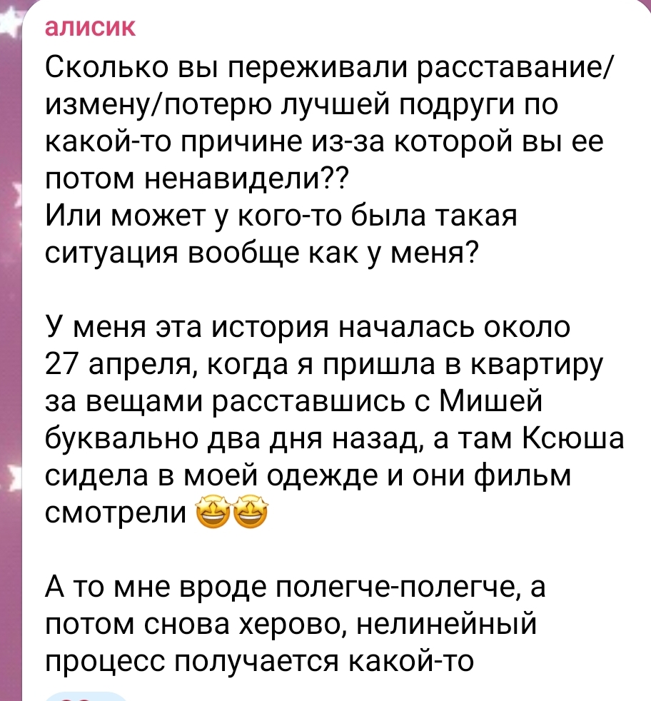 >>6446053 Бедная тян, очень сочувствую. Чушки то понятно, кал говна, но вот предательство подруги - пиздец полный. Не представляю как я бы психовала на её месте, наверное всё кончилось бы тяжкими телесными, получили бы и кун и подруга. А так, не удивительно, что она об этом так много говорит и пишет, ей явно очень тяжело и некому высказаться. Надеюсь, ей станет лучше.