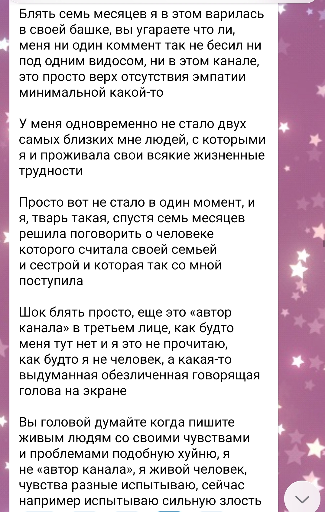 >>6445662 О, я видела ее тикток на несколько частей более полу года назад, хз почему ты самую мягкоту не принесла, где она через несколько дней после расставания пришла в их бывщую общую квартиру за вещами, а бывшая ее пидружка сидела в ее же вещах)) Недавно смотрела на ютабе обзор на фильм, и она там рассказывала, что как бы мы не дружили с кем-то и не открывались на сто процентом, мы никогда не знаем, чем будет руководствоваться человек, с которым мы откровенничаем, зачастую если у друзей все хуево, а у тебя все хорошо, они неосознанно начнут своими советами или действиями портить тебе жизнь. Я думаю с ее пидружкой вышло так же, она просто хотела занять ее место, ей двигала зависть, это пиздец если так подумать, ни с кем нельзя быть на стопроцентов откровенной