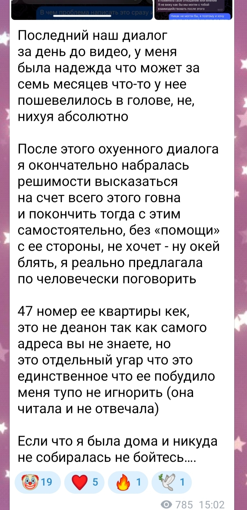 >>6446484 >она в аффекте после этой истории Блин, ну больше полугода там прошло по лору и она это все творит. Аффект так долго длится? >>6446468 Воо, мои мысли описала. Не просто так они все столько лет общались. Скажи мне кто твой друг и я скажу кто ты. >>6446425 >Обсуждение ситуации с подругами и реакция Миши Рассказчица поделилась ситуацией с подругами в чате, подробно описав все мелочи и массажи. Подруги подтвердили, что её чувства оправданы. При чем и подруги, помимо злосчастной, имеются. И все поддерживают. Но таким нарциссихам мало, надо больше и больше высасывать.