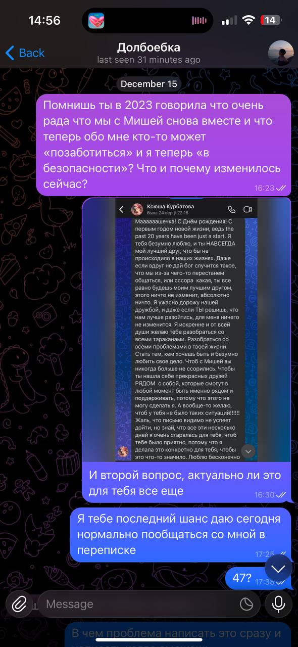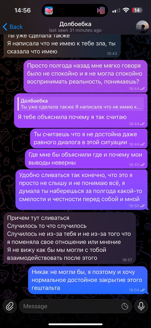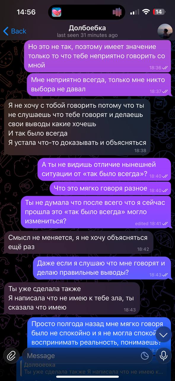>>6446501 Это самые адекватные варианты, если хочешь расстаться с человеком, который болеет, лол. Хотя это вообще бред относиться к людям с прл, как к инвалидам, такие же люди. Если знаешь, что человек может не отпускать, истерить и тд, то ставишь жёсткую точку. Ясно понятно, что если вы оба взрослые и адекватные, то все спокойнее должно быть, ну а если ситуация как эта, то только такие варианты и остаются, а иначе они будут тянуть, тянуть (якобы из-за жалости к девушке, а на деле из-за собственной слабости и инфантильности), чтобы потом изменить, лол. С бликом же такая же ситуация была. Вместо того, чтобы поставить точку, он все терпел и терпел, чтобы по итогу сорваться и сделать хуже.