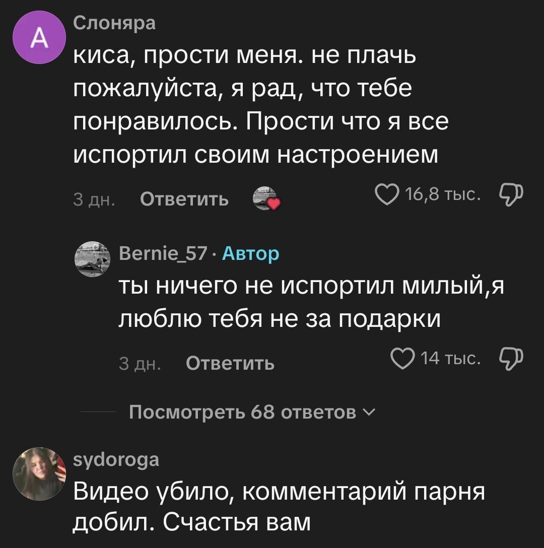 Блять ну когда это сделает ребенок старик любой человек НО НЕ ТВОЙ ПАРЕНЬ это пиздец мило. А так только жалость к тян появилась. Коммент от парня вообще жалкий пиздос