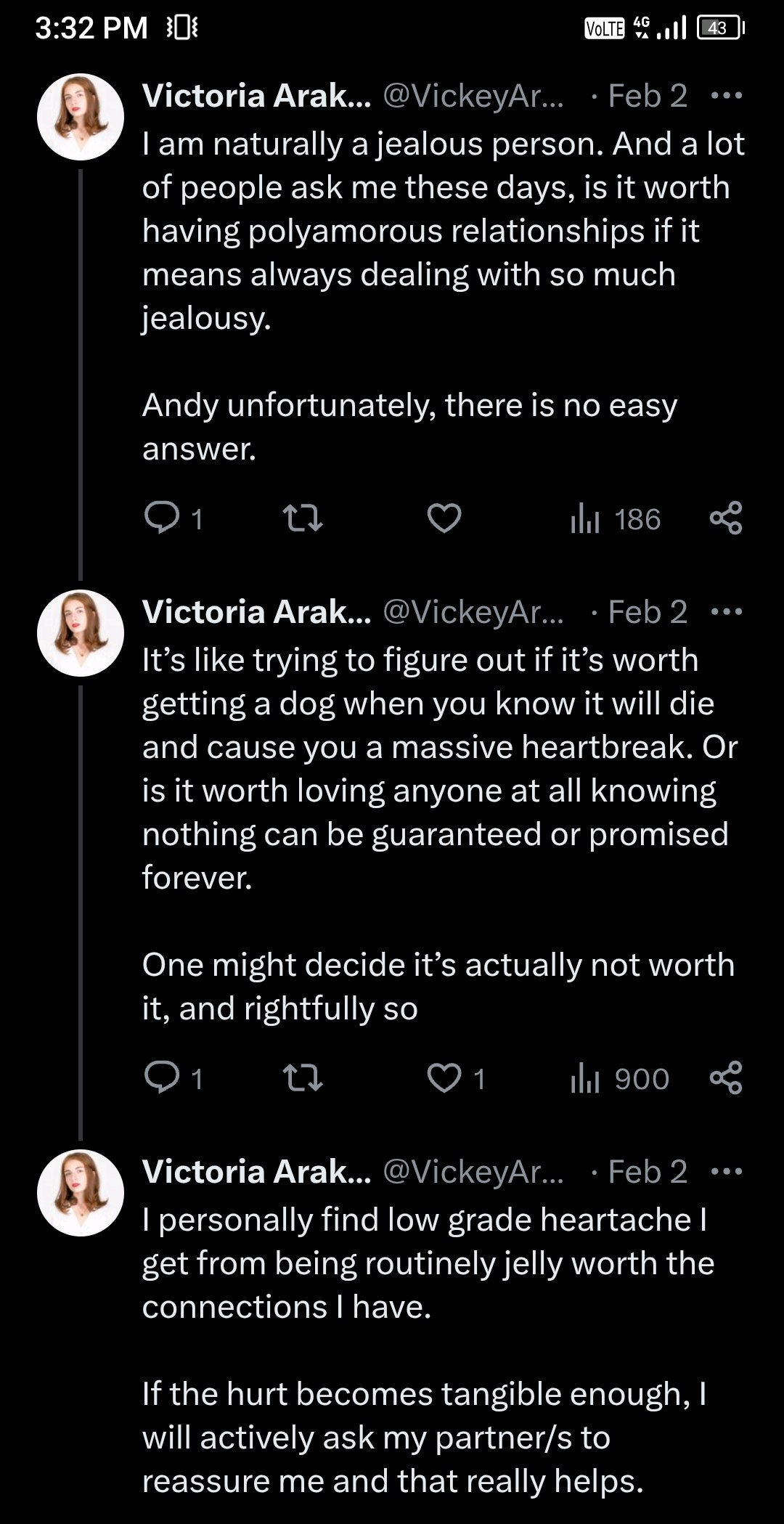 >Лично я считаю, что та слабая душевная боль, которую я испытываю от регулярной «ревняшки», стоит тех связей, которые у меня есть. >Если же боль становится ощутимой, я прямо прошу своих партнеров успокоить и поддержать меня, и это действительно помогает.