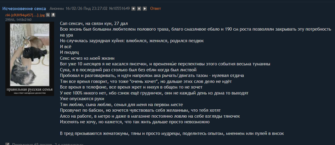 >>6446899 Ебать копиум Может это уже какой-то стокгольмский синдром хз Меня в таких историях больше беспокоит что мужикам окей трахать жену которую он не возбуждает, более того ей это неприятно психологически и физически Блять я хуею какие куны нелюди буквально