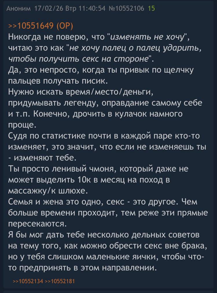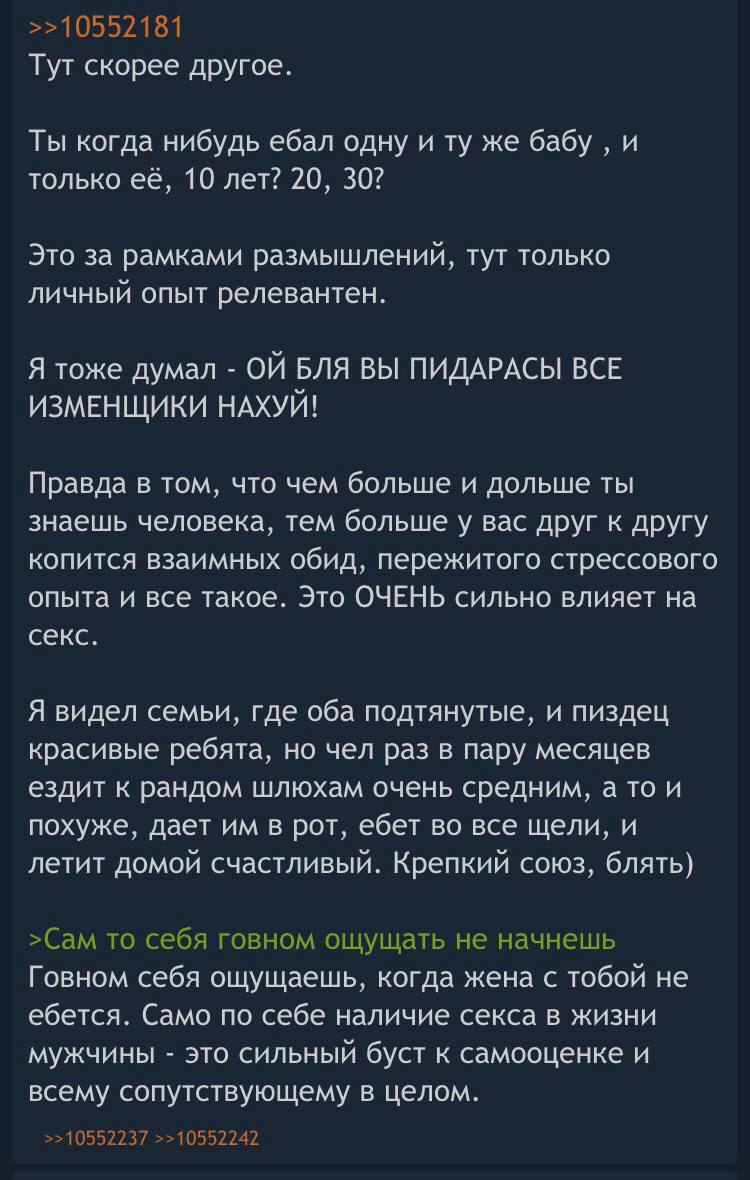 Не понимаю почему вообще такие ситуации происходят. Никого не принуждаю не к чему, просто пытаюсь ход мыслей понять. Разве нет мысли что давать «надо», не так значит по другому, какие-то способы. Полы мыть тоже не хочется а надо, грязно будет, так же и тут. Причем это же в интересах жены, чтоб снизить хотя бы немного вероятность измен. И потом разовая измена это одно, а когда секса долго нету, могут и любовницу найти и вдобавок к ней привязаться