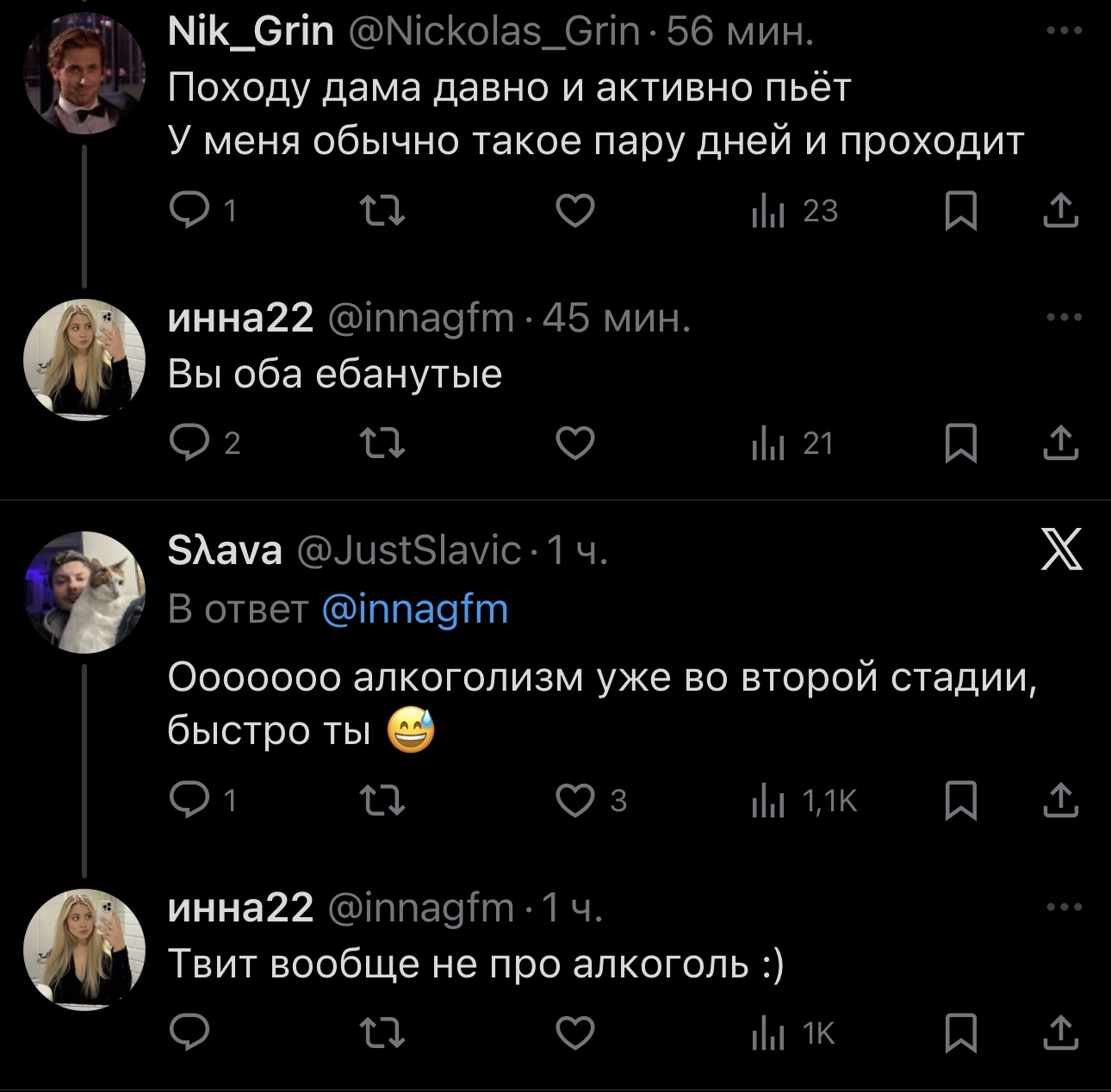 А сейчас они пытаются на ее фоне казаться типо адекватными. Хотя по факту она им помогла встретиться, без нее они бы на сз ловили скам или ещё где то искали общие темы. Ну посмотрим, как они охуенно семейку построят без этой рыжей тянки, которая им мешала. Не удивлюсь, если хейт или жалость к ней их и скрепляли.