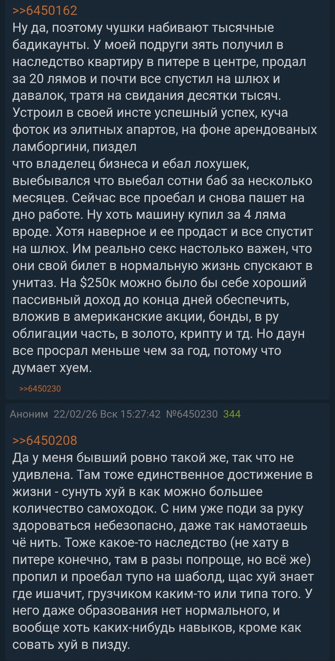 >>6450428 >Ты сама написала, как трясешься за то чтобы общество тебя не осудило Так оно меня не осудило и никогда не осудит, потому что я умная и никогда не была самоходкой. К сожалению, другим тянкам не повезло и они повелись на уговоры чушков или либфем промывку. И сильно об этом жалели. Мне жаль тянок которые в школе просто доверились хую и залетели в 16, ну или стали жертвой травли с подачи тех же хуев, которые их ебали. Очень жаль, что им вовремя не попался кто-то умный и не объяснил бы, что нельзя доверять хуяв, какими бы красивыми и хорошими они не казались >Это компенсация для тян, которым секс сам по себе неинтересен. Это норма здоровой тянской психики, чушань. Как бы ты не визжали и не топал ножками. >Пикрил Ты уже второй раз кидаешь свой шизоидный пикрил. Ты не умеешь в аналогии, не умеешь в примеры. Я стараюсь брать от патриархата лучшее. Поэтому самоходкой не буду. Но и рожать сыновей не буду. Прикинь так можно. Касаемо чуркостана, умные хитрые тянки там стараются выжать из своего положения максимум. Например, трясти с мужа максимум денег и подарков. Глупые понятно на махр финик просят. Умные недвигу, машины.
