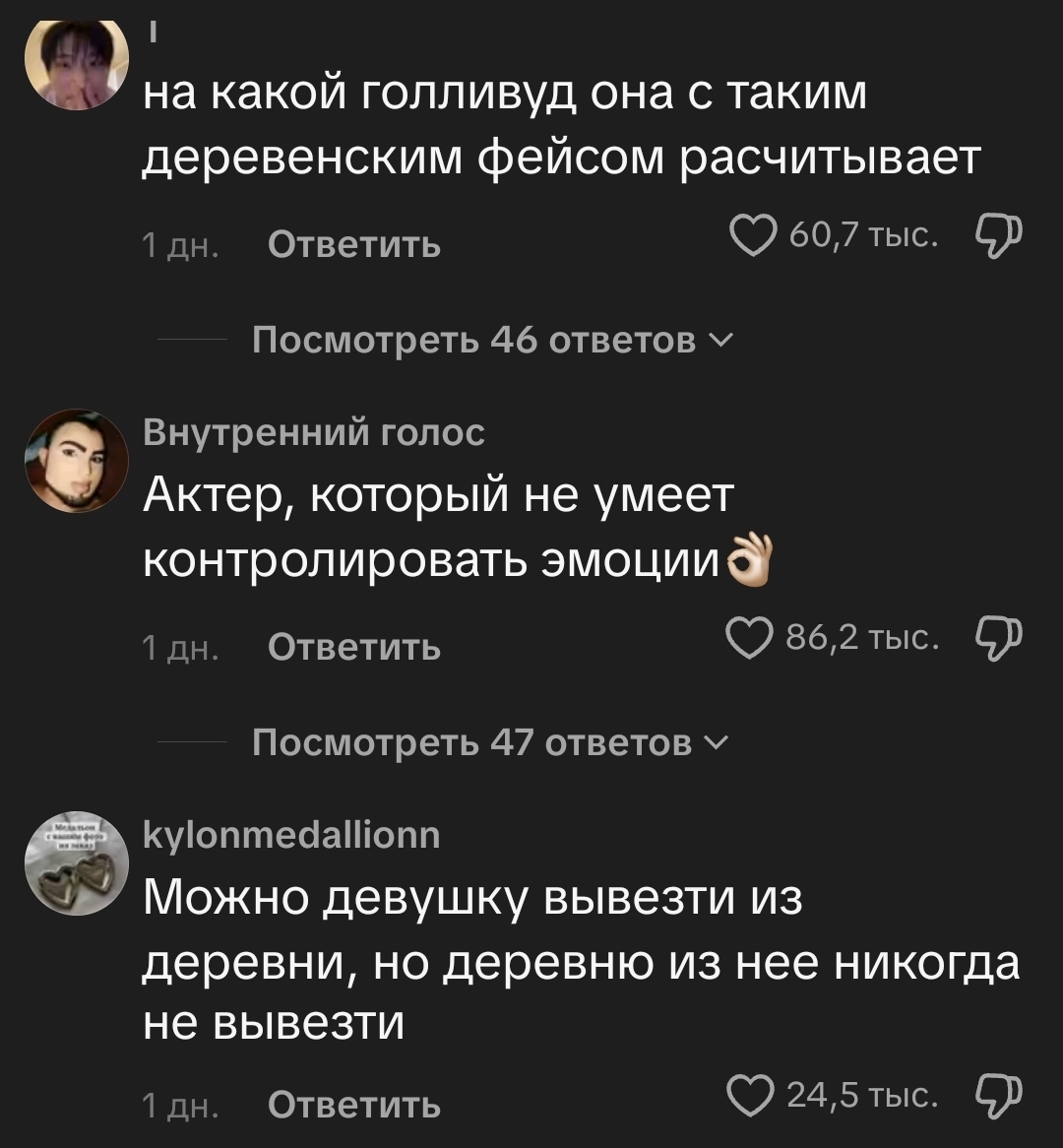 Потому ее слил Сруль и Хабенский не повелся. Без миллиарда фильтров, под которыми и 90летний районный алкаш станет королем луксмакса, она сельская жирная девочка с брылями, воняет гнилыми зубами и рыбой, с уродливыми партаками и приклееным к голове канекалоном (это всегда пиздец заметно). Надо реально долбиться в глаза6 чтобы это не видеть. Наверное, для тебя и карачмо богоподобна красива6 а не деревенский поросенок, закусивший щеки