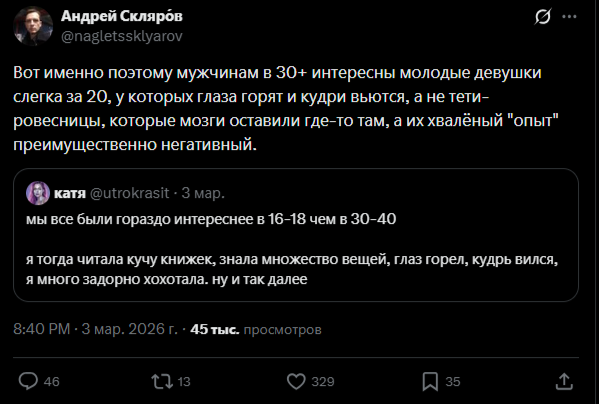 >>6458577 По поводу молодых и интересных - манямирок. Ну да, в пездючестве больше сил и желание читать всякие книжки и размышлять о высоком. Но там обычно охуительные идеи уровня б - типа напечатать побольше денег и победить бедность. А скуфы-детоебы, конечно пиздец тупые. Вот прямым текстом говорят, что негативный опыт у тян - минус. Логично, потому что именно он помогает им фильтровать таких как он на подходе. А юной неопытной тяночке можно и в уши нассать.