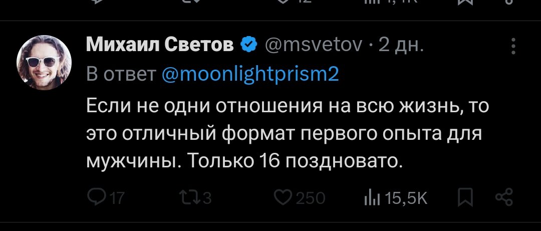 А вообще все эти миллионы скуфов, ебущие малолеток, это какой-то псиоп, лол. В реальной жизни таких историй 3.5 штуки, на одного скуфа, нашедшего себе писечку хотя бы на пару месяцев, приходится сотня тех, кто уныло дрочит, спивается и бомбит из-за того, что ровесницы смотрят как на говна. Ну а вчерашние школьницы тем более, ему только место в транспорте уступить могут.