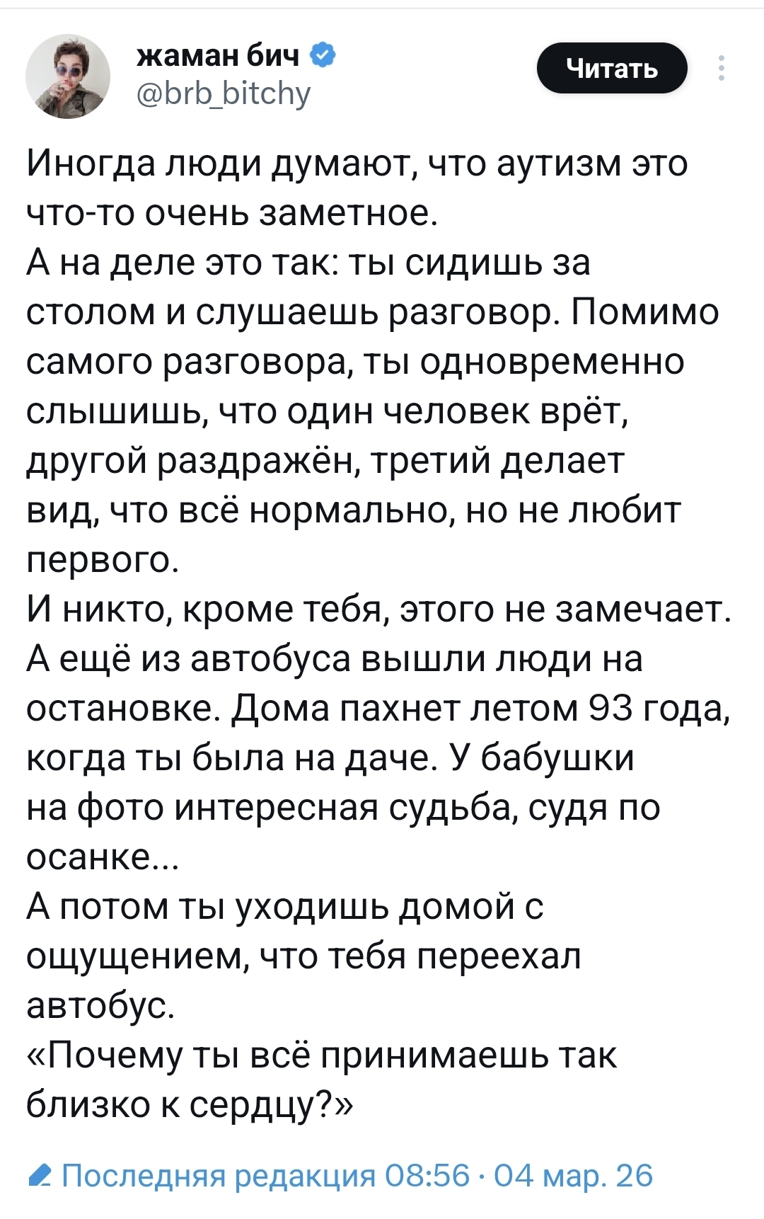>>6459195 Постерша со скрина приводила в пример книгу про потерянный пласт недиагностированных женщин, у которых аутизм проявляется иначе. Обдумывание чужих мотивов сверх меры тоже не дает объективной оценки для нормального общения