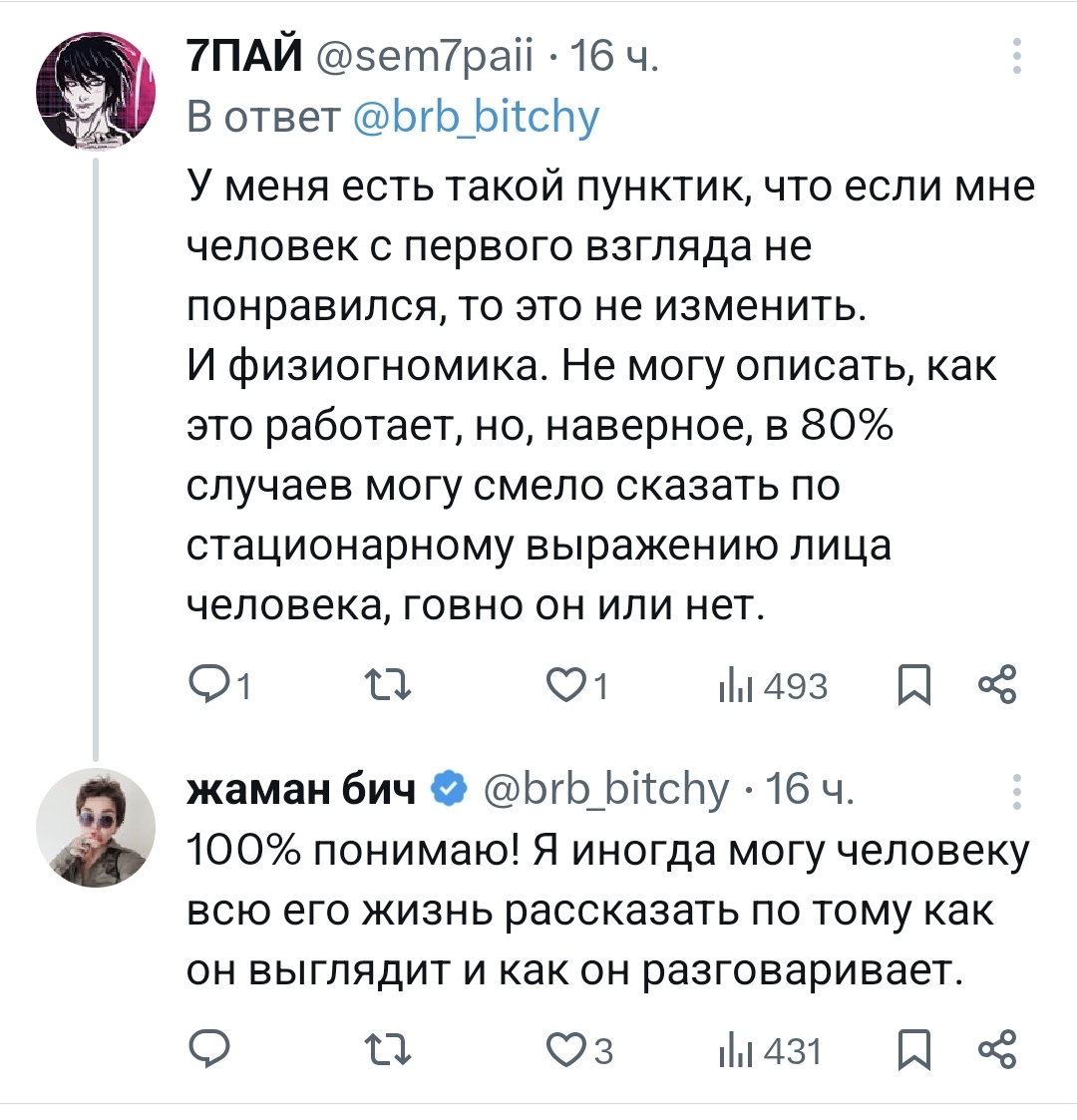 >>6459156 >>6459155 Ну я тогда тоже аутистка, лол, но думаю это все же иначе называется и точно не диагноз. В плане того, что я хорошо чувствую речь (и письменную, и устную) и легко ловлю людей на противоречиях или по каким-то формулировкам легко понимаю, что у человека болит и что он на самом деле имеет в виду. Причем, у меня чуть ли не с детства такое было, но меня часто газлайтили, особенно мама почему-то. Помню прям несколько моментов из детства, когда я ей четко говорила, что мне кажется вот так. А она мне - ой, ну что ты выдумываешь. В итоге я оказывалась права. И с физиогномикой та же история. Я составляю о человеке впечатления очень быстро и почти всегда оно верное. Если мне кто-то сразу не понравился - оказывается чертом. Но возможно, конечно, это ложные воспоминания или такое у многих людей есть. Хотя эпизодов, когда другие эту хуйню не замечали было жопой жуй.