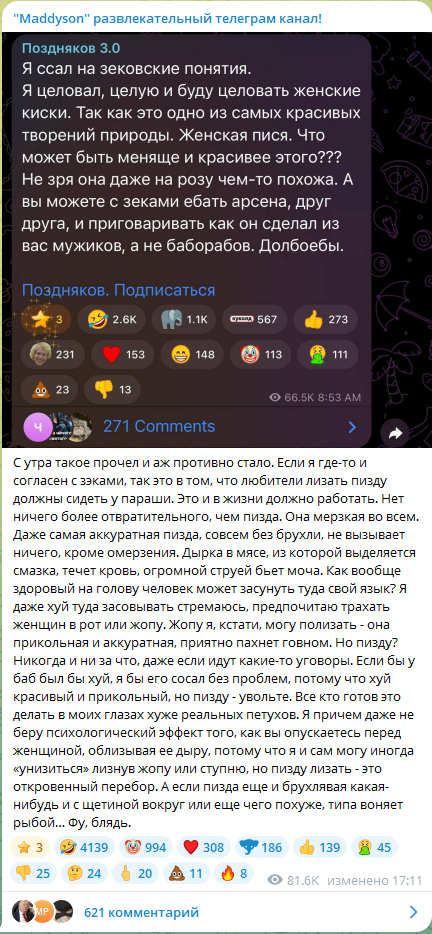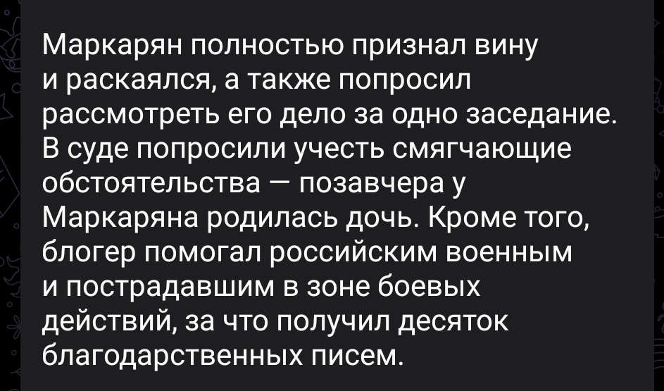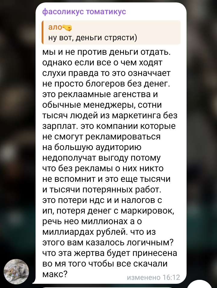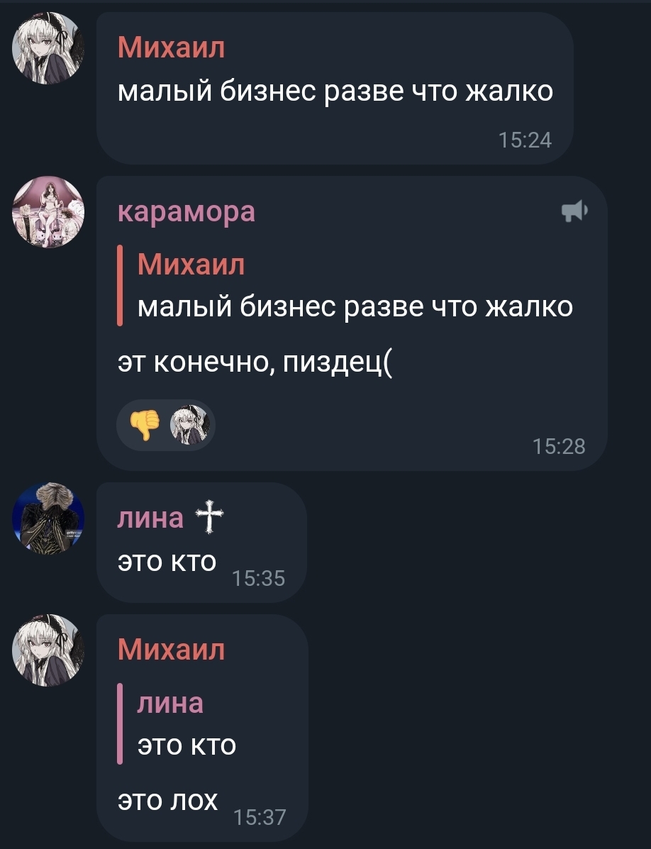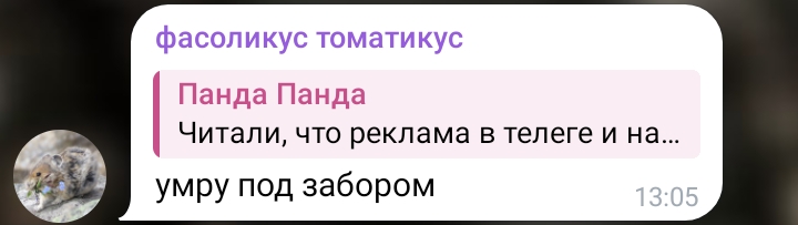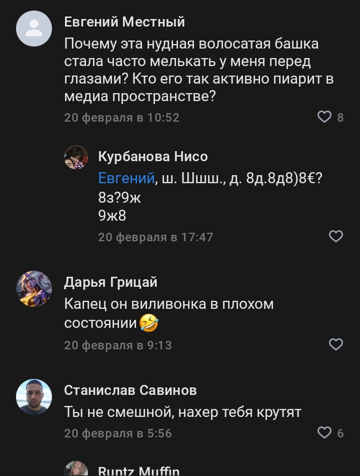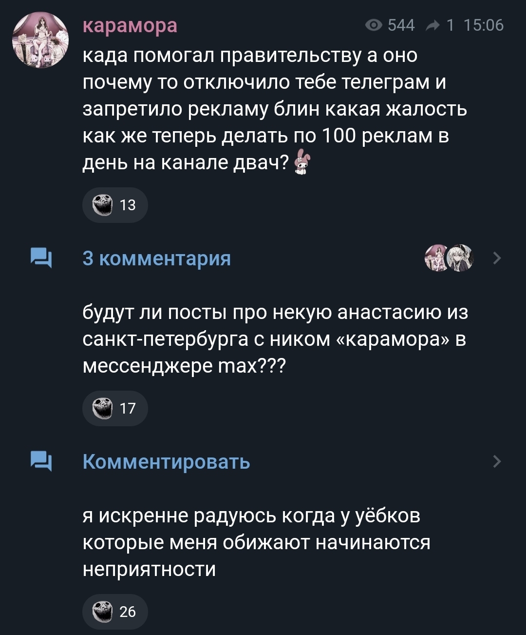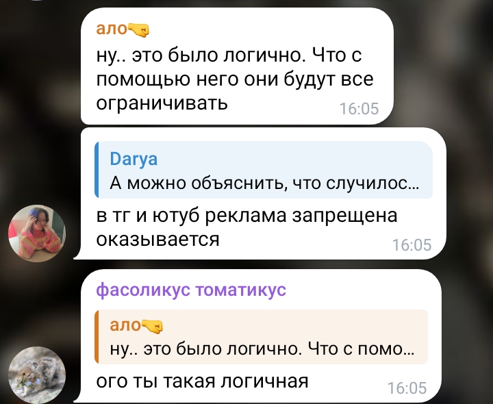 Караморыш там радуется, что рекламу в тг продавать нельзя будет и Абу без денег останется, и что тем кто ее обижал плохо будет. Только ынтелектуалка не может понять, что он просто постит новости с двоща и все, а не ее персональный киллер. а радоваться тому, что власть рф хуеет и душит людей в целом дурной тон и плохие манеры, как желать кому-то тюрьмы