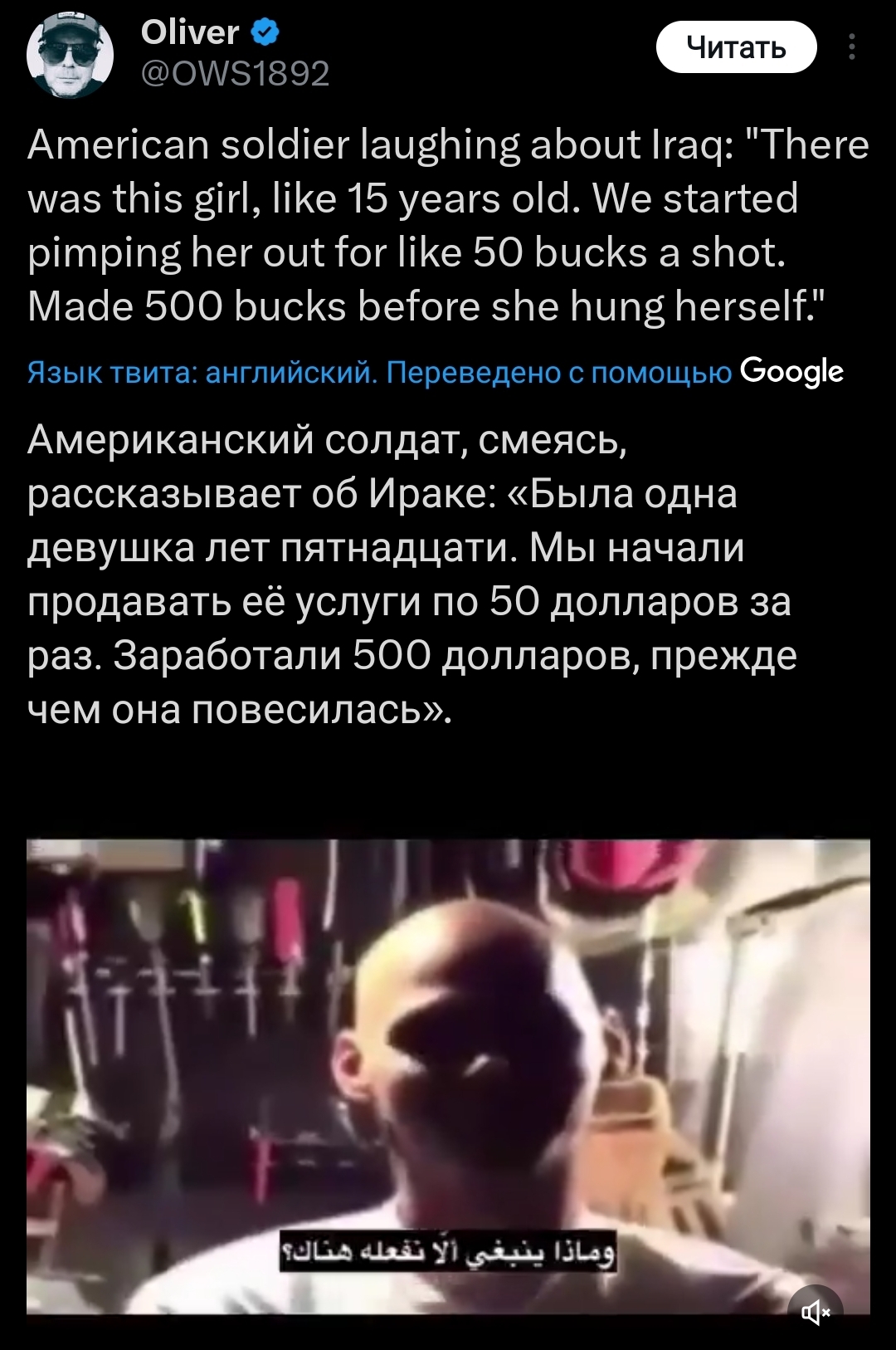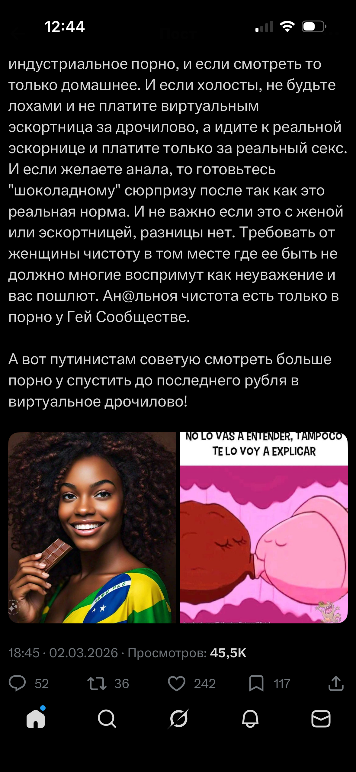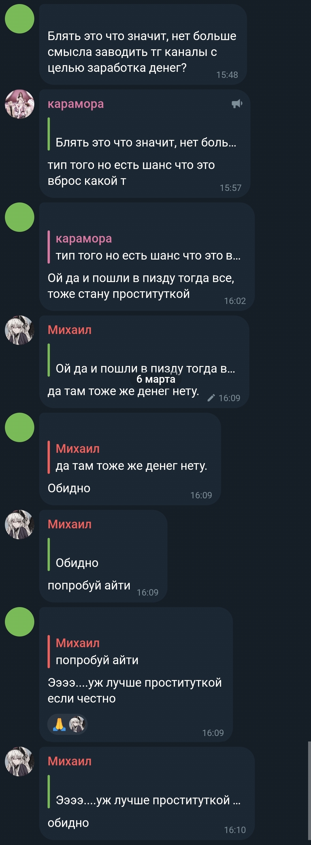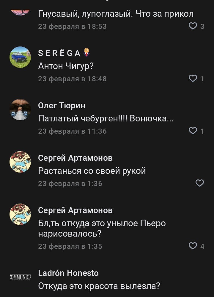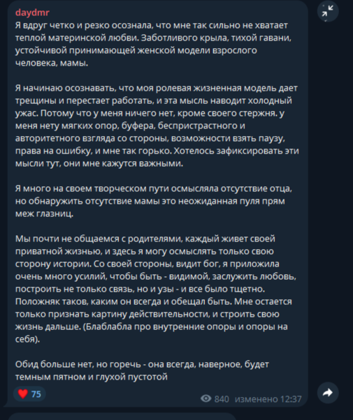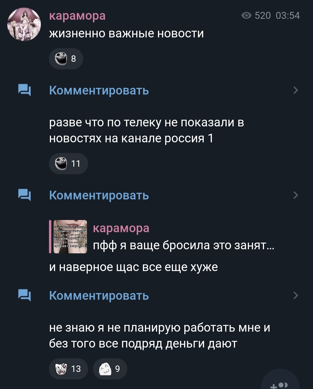Караморыш там радуется, что рекламу в тг продавать нельзя будет и Абу без денег останется, и что тем кто ее обижал плохо будет. Только ынтелектуалка не может понять, что он просто постит новости с двоща и все, а не ее персональный киллер. а радоваться тому, что власть рф хуеет и душит людей в целом дурной тон и плохие манеры, как желать кому-то тюрьмы