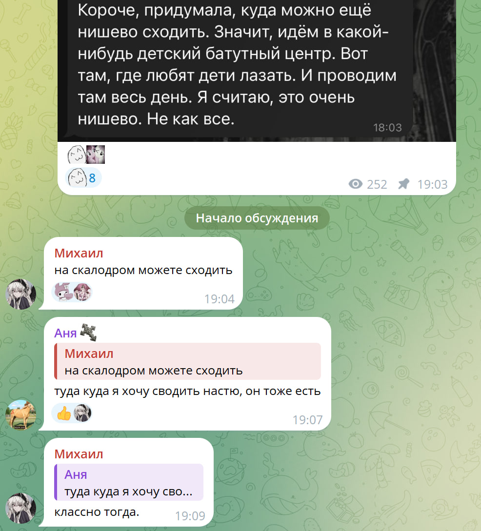 Ниче Сисы скоро лето буду сруля у мармышки уводить, а потом кину чтоб слезы по усам текли. Ну если он меня при первой встрече не пошлет, я изучила его историю отношений (спасибо сисе) у меня как раз есть три гавностишка со студенчества и хуйдожества уровня Мармышки. Думаю мож блог об этом снять, но меня захейтят. В любом случае попробую хотя бы, я недалеко живу.