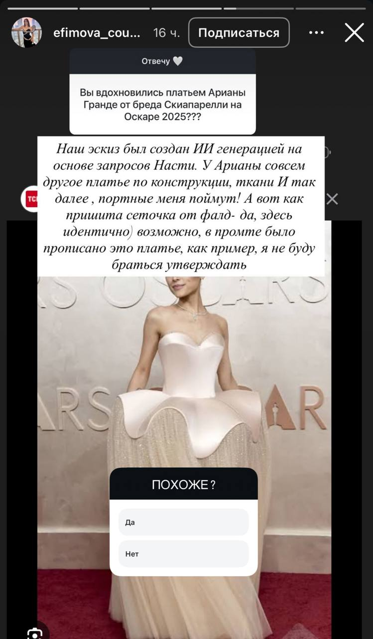 >>6459733 Я вообще не понимаю зачем они использовали ИИ для эскиза. Почему кутюрье сама его не сделала? По-любому ей как профи виднее какой цвет и фасон подошёл бы Сратько. Или это платно и они даже на этом секономили?