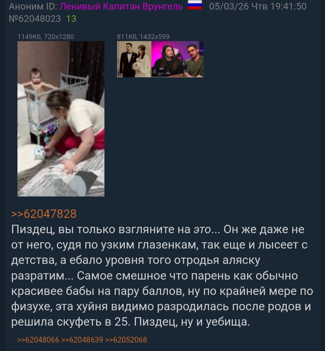 >>6459714 Многие здесь пишут, что у всяких мизогинных скуфов нет шансов на тян или они крайне малы. Но из раза в раз оказывается, что с поиском жены или секса не за деньги у них нет проблем, как бы они не ныли. Вот и у пучеглазого комка из слива нашлась тян, готовая от него родить. Не испугалась его диких требований, гайда по износу, влечения к детям, его пдф прошлого и родила... девочку.