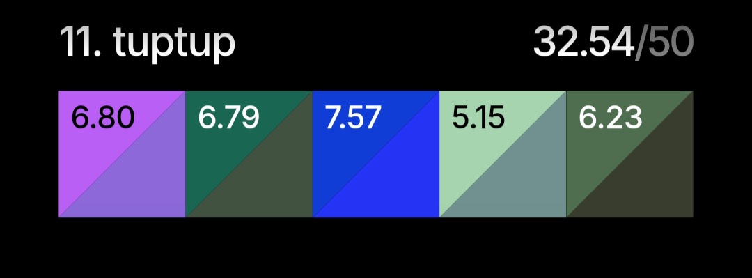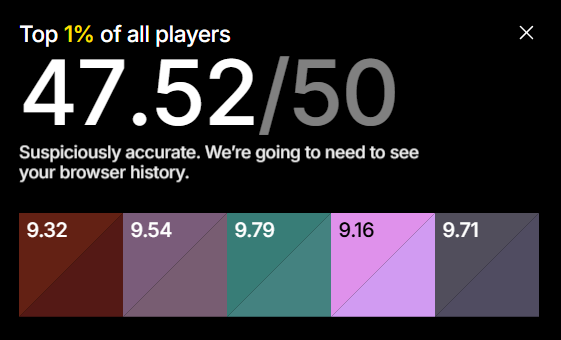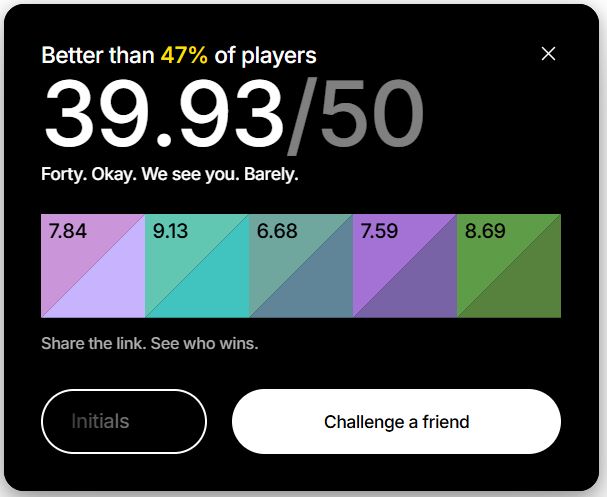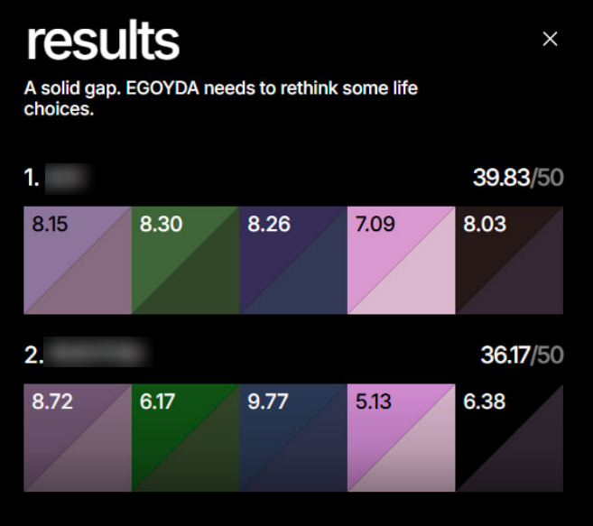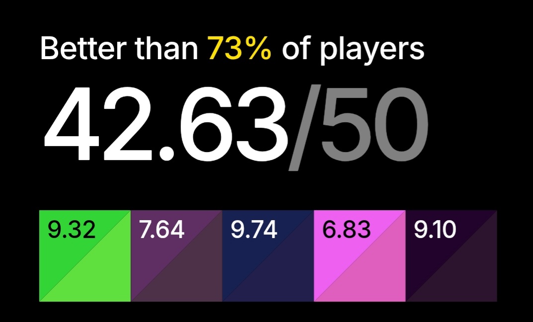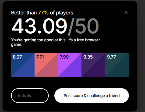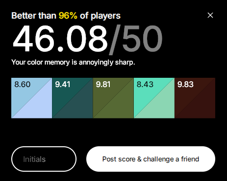 Цвет появляется на экране, запоминаешь его, дальше пытаешься его повторить, двигая ползунки. И так 5 раз. Каждый результат игра токсичит, если угадываешь цвет не очень хорошо, кек. В конце считает общий результат.