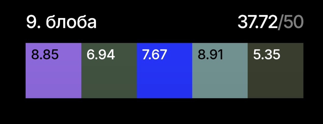 Такое получилось. Да ну, это нереально угадать в точности. Был тест, где надо было расположить цвета по радуге, там было много переходных оттенков. Я запуталась в сине-зеленом спектре, 4 кажется цвета перепутала местами, мне реально трудно было определить, какой из них более синий, а какой более зеленый. Ну я по жизни в этих оттенках путаюсь.