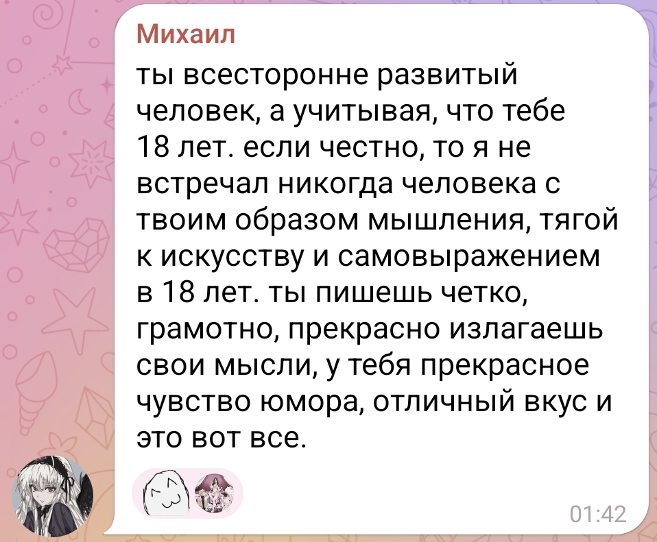 поясняю для тех кто абсолютно ничего не знает (вспомним что было 1700 лет назад) в 2022 я зашла не в ту дверь и к своему величайшему сожалению была в 1,5г отношениях с настей гречкой которая сейчас занимается публичным аутингом [Аутинг (от англ. outing — «выведение наружу») — это публичное разглашение информации о сексуальной ориентации человека без его согласия] одной очень популярной девушки которая сейчас на хайпе и которая работает на русскоговорящую аудиторию (сложите сами 2+2 и почему это неприемлемое поведение)