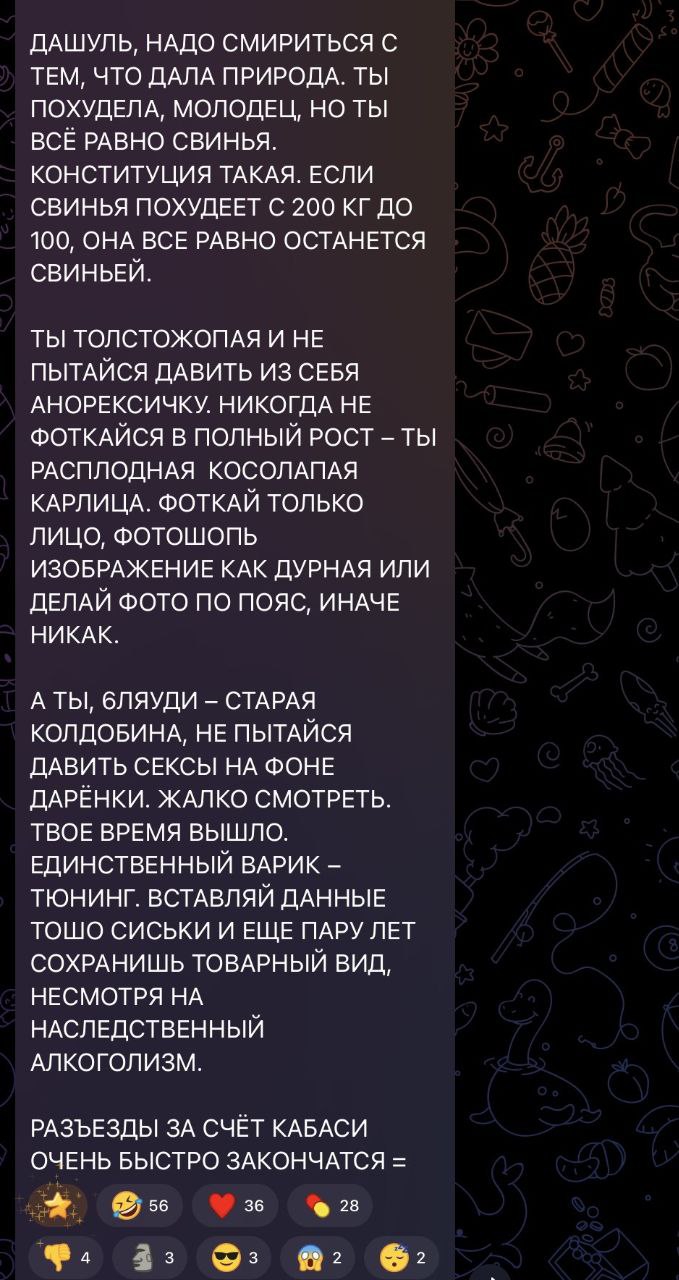 Ну и что это за хуйня. Контент-машина у которой за отпуск полтора поста и кружочек в тгк. У каплан вон нескончаемые фото во всех соцсетях, тиктоки, даже видик с макияжем записала. Машке бы дропнуть усатого для поднятия продуктивности и в целом жизнеспособности)