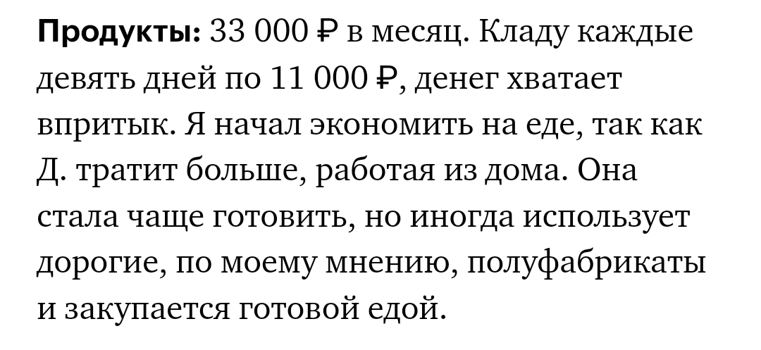 >>6476156 Живем вдвоем на такие деньги квартира своя, даже пару раз в месяц кафе посещаем. Питание курогрудь, крупы, незамысловатые овощи и фрукты, молочка, иногда сыры. Но одежды особо нет, несколько комплектов «на выход», дома бесплатный шмот из гуманитарки