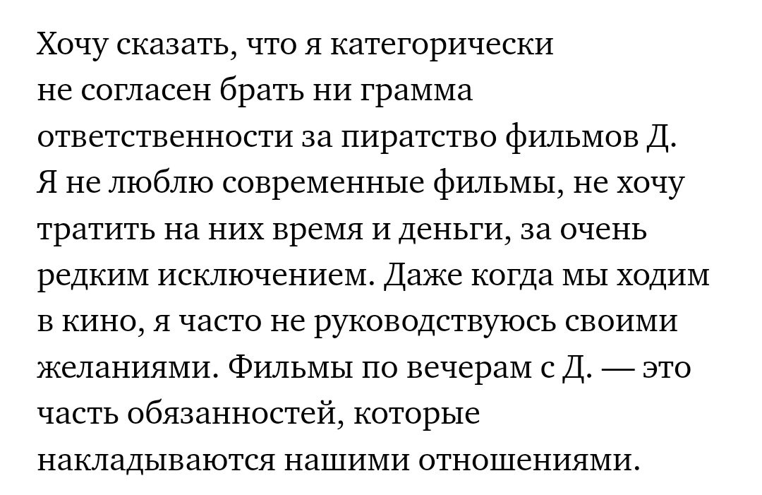 >>6474971 Но у меня полная семья. И два младших брата, которые уже, правда, тоже взрослые. К тому же имеются и другие родственники. Мамины сёстры, конечно, вообще не понимают мой образ жизни, но всё равно любят меня, отмечают, какая я умная и талантливая, и что зря я себя нигде не проявляю. Не пытайся меня пристыдить. Я не вижу ничего плохого в себе, зла никому не делаю, просто живу. Забочусь о домашних животных, летом буду как обычно помогать на огороде (не на самих грядках, а в доме что-то готовить вкусное). Я не только потребляю блага семьи. Конечно, если бы денег не хватало и меня содержала мать-одиночка, к примеру, то моя судьба сложилась бы иначе. А так я никого не обременяю. У всех свой путь, как вы этого не понимаете? Мы не обязаны жить одинаково. Осуждения заслуживают только маньяки, насильники, живодёры и прочие деструктивные личности.