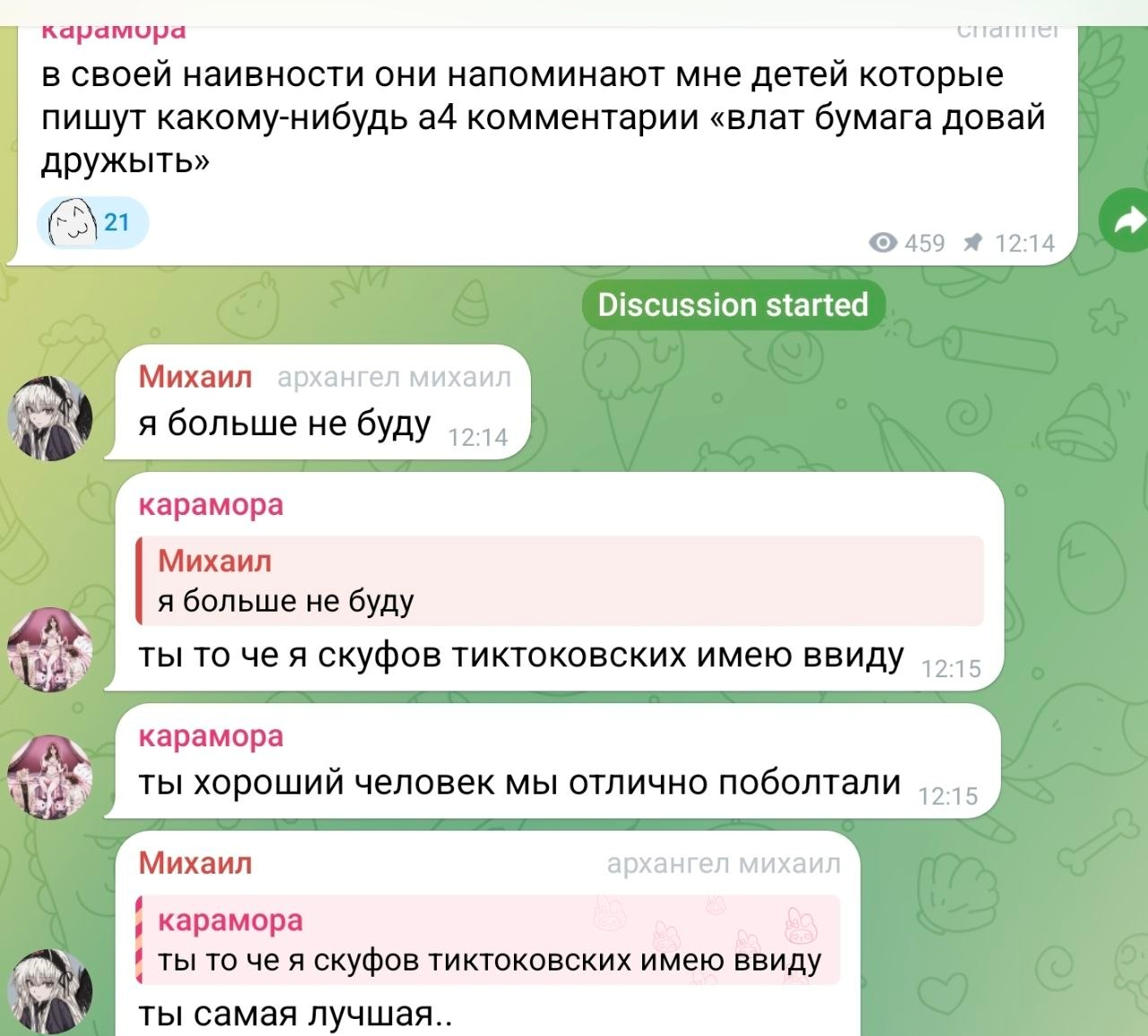 >>6482420 А мне кажется, что ты преуменьшаешь их влияние. Конечно, если дети уже запущенные, малолетние преступники и наркоманы, тут уже мало что сделать, но нормальный родитель не должен допускать пиздеца как у карачмохи. Свое детство и пиздючество я прекрасно помню, как и детство своих одноклассников и друзей. Я не росла в маргинальной обстановке, за мной и другими детьми следили родители, взрослые, учителя. Когда я в 14 лет пошла на свиданку, родаки с бабушками и дедушками собрали семейный совет и объяснили почему это плохая идея лол. Хотя у нас были девчонки в школе, которые трахались с дноклассниками, но никогда не было историй с наркотой, педофилией и прочей жестью как у карачмо