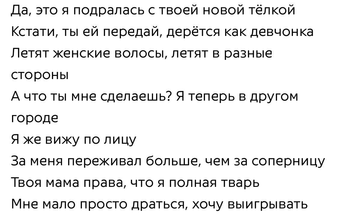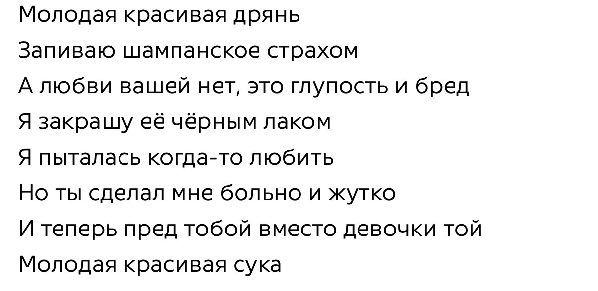 >>6483114 До меня только благодаря этому треду дошло, что она кармическая близняшка нашего светуса. Если бы светус писал песни, там тоже было бы пикрил (трецк «молодая красивая дрянь»).