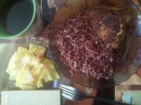 Куриные бедра в остром маринаде, настолько остром, что явно с чили переборщил.Острая же капуста.Рис Рубин.