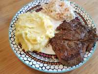 Приятнава ипитита.Особливо вам, дорогие доброжелатели >>294152 >>294185 >>294190.Катлетосик с курагой, лучьком, чесначком, из подмаринованого лемонным соком свеного фарша. Картофели политы натечью от катлетосов.